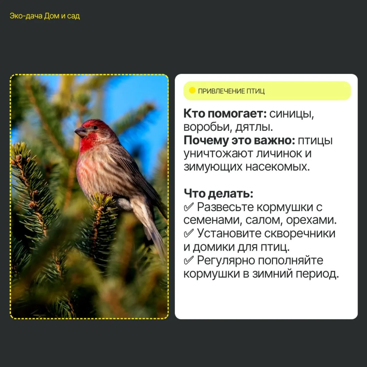 5️⃣ Привлечение птиц – развесьте кормушки для синиц и воробьёв.