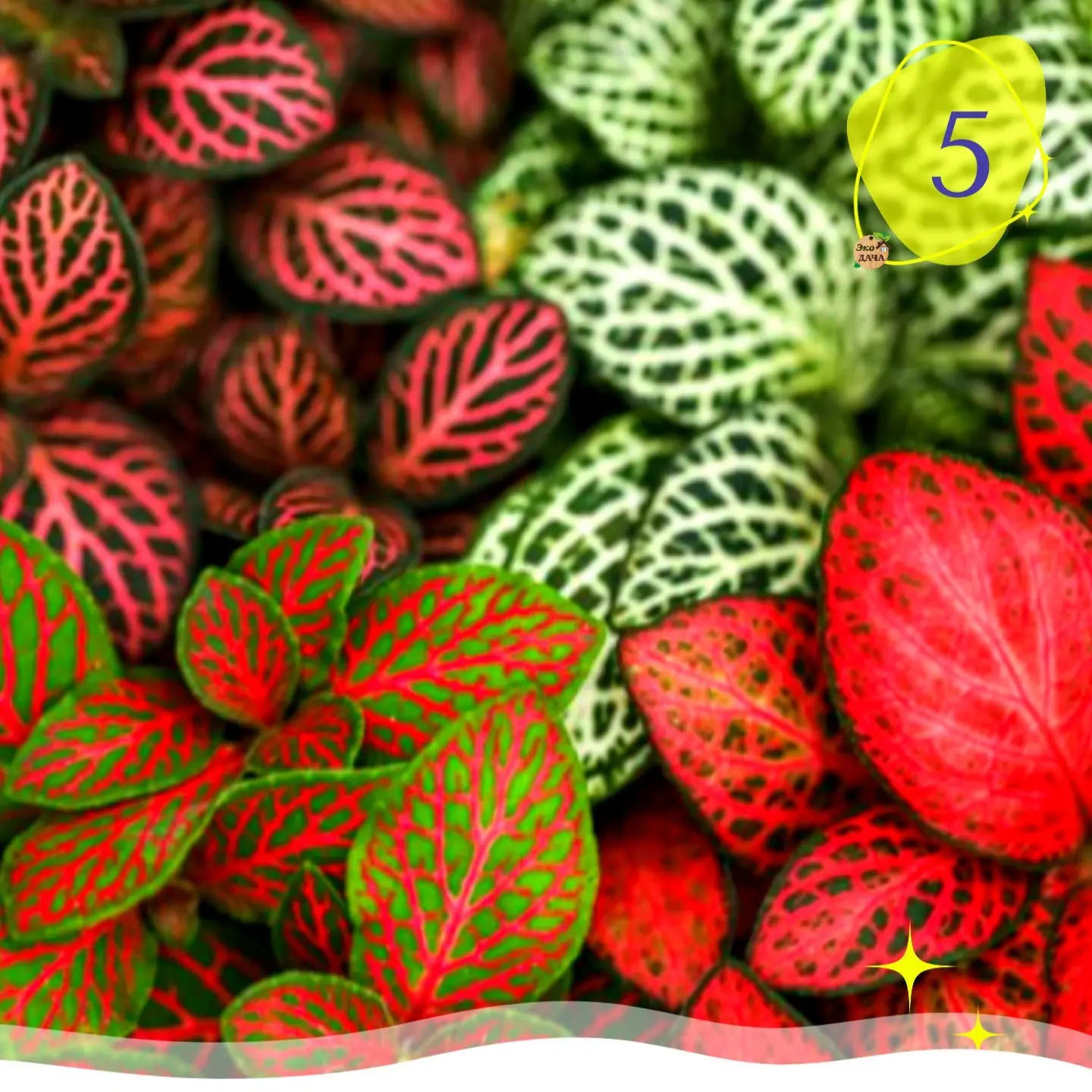 5️⃣ Фиттония — миниатюрное растение с яркими прожилками. Любит влажный воздух и рассеянный свет.