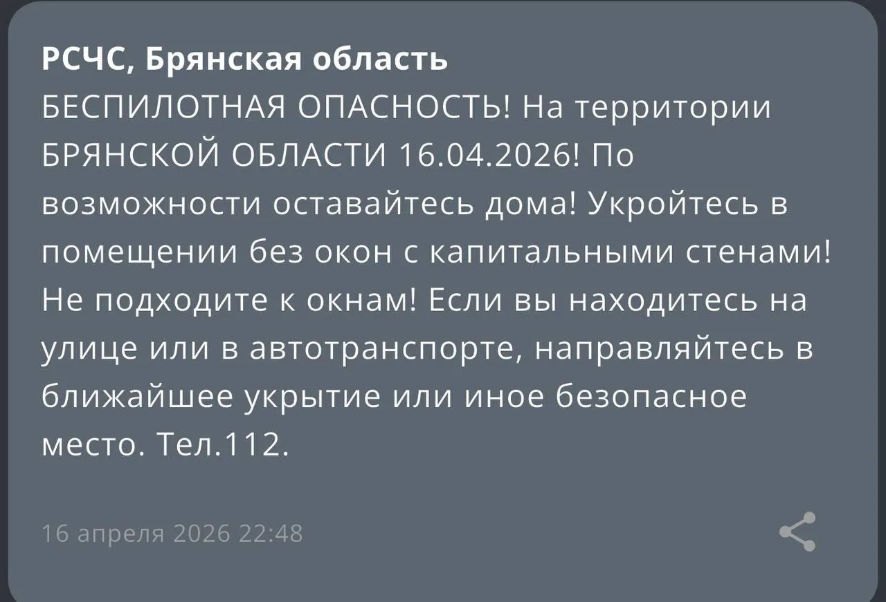 🔴 Опасность атаки БПЛА объявлена в Брянской области - об этом сообщает региональное МЧС!