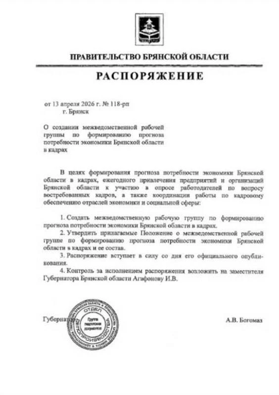 🔴В Брянской области создали штаб для прогноза кадрового голода