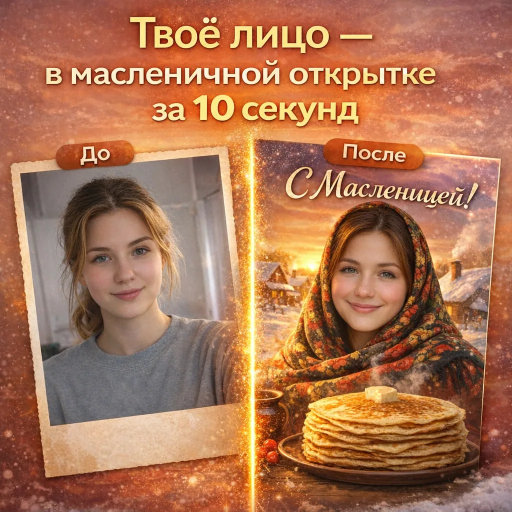 Загрузи фото — и уже через 10 секунд получи свою масленичную открытку.