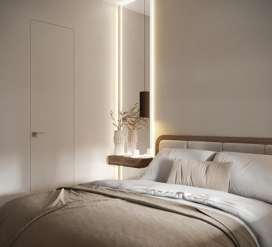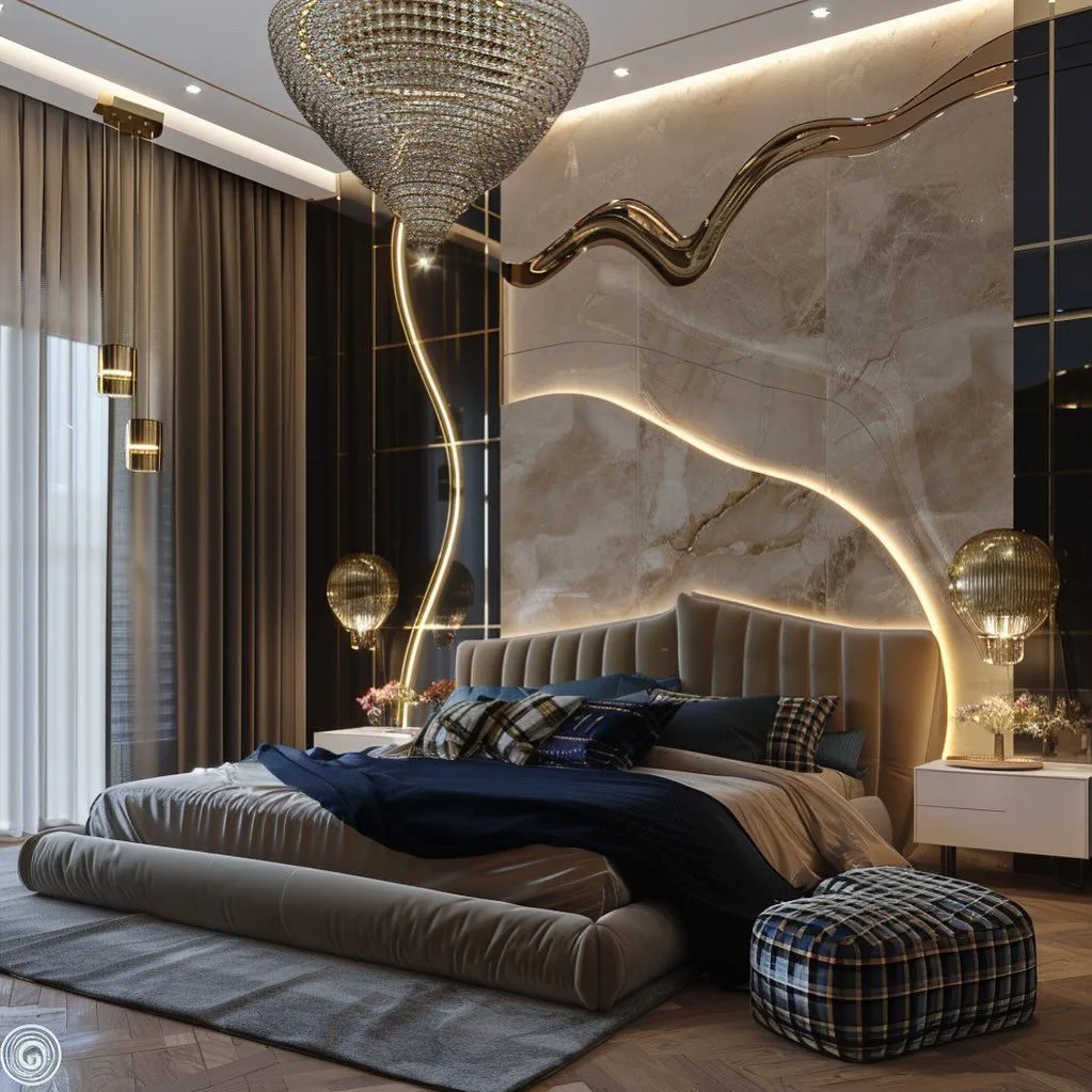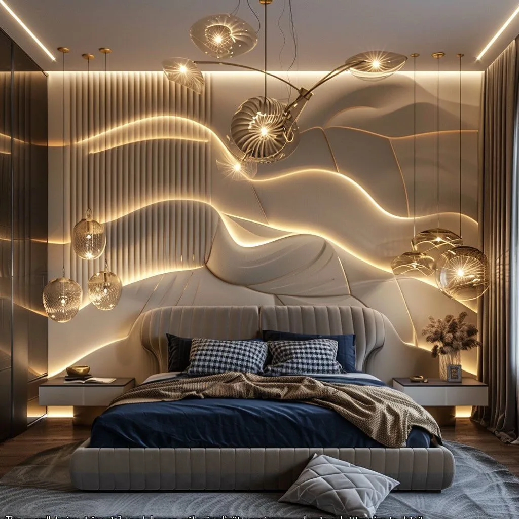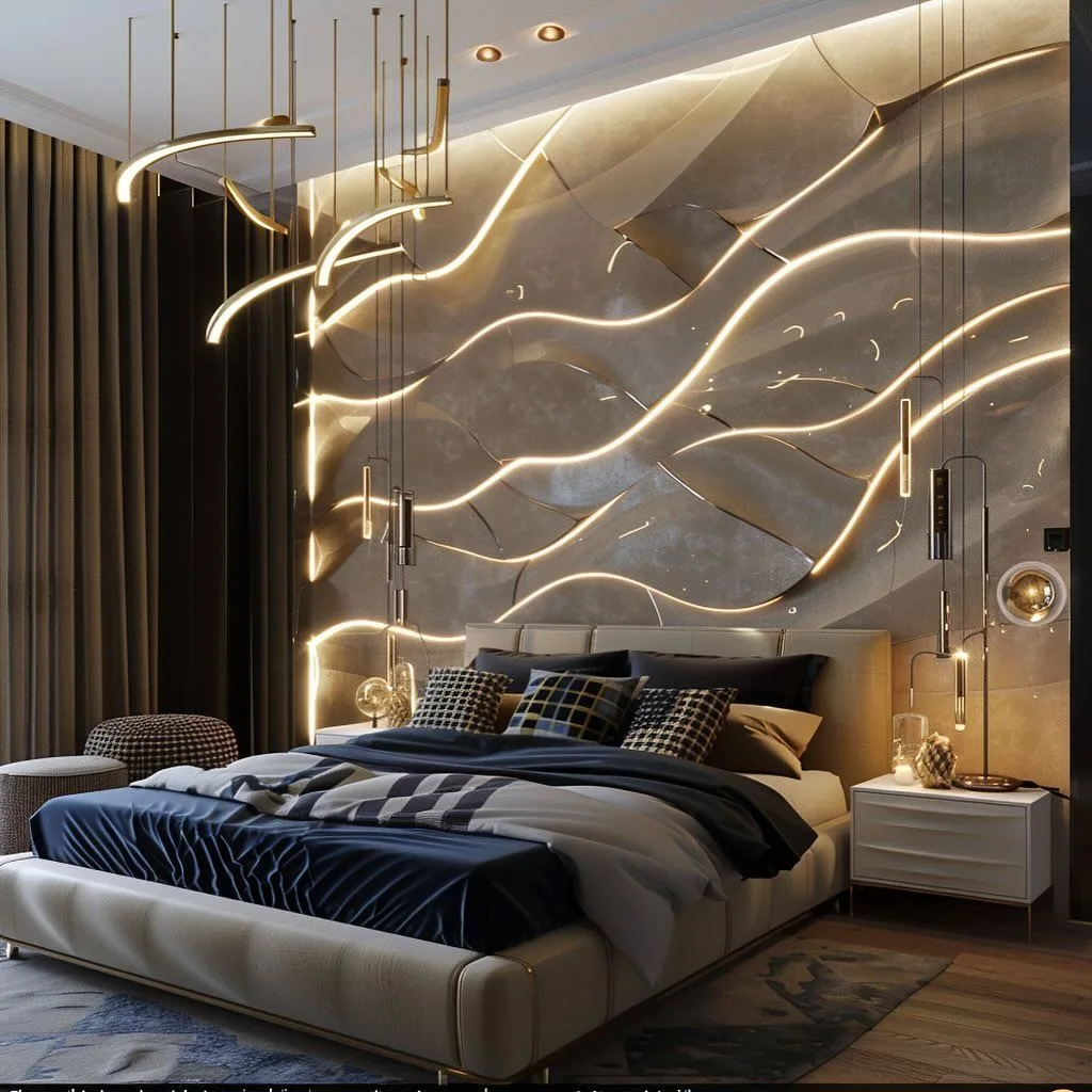 Объёмная стена с подсветкой за изголовьем создаёт невероятный эффект, завораживает и преображает пространство. Жаль только, что такое решение требует серьёзных вложений… 😅
