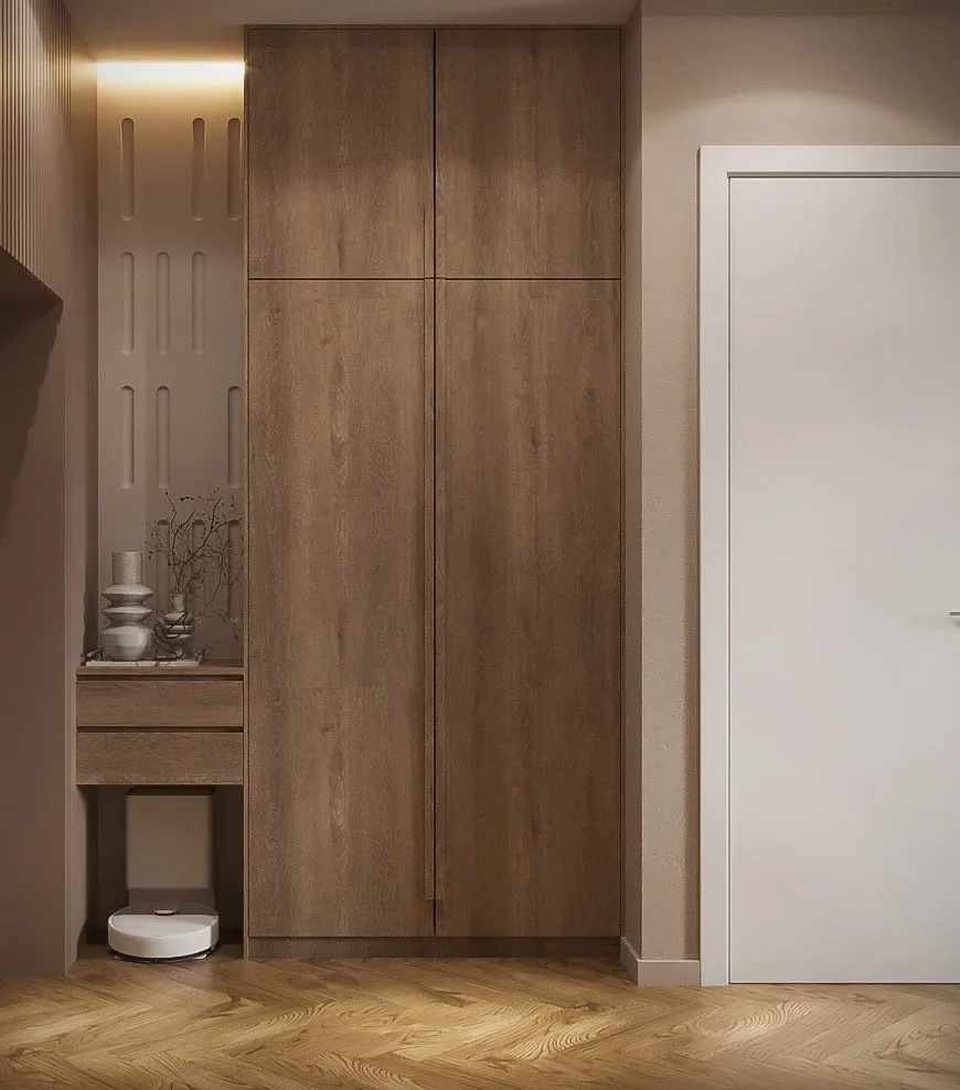 Если вам важно иметь отдельную гардеробную, но спальня не отличается большой площадью, такое решение станет отличным выбором
