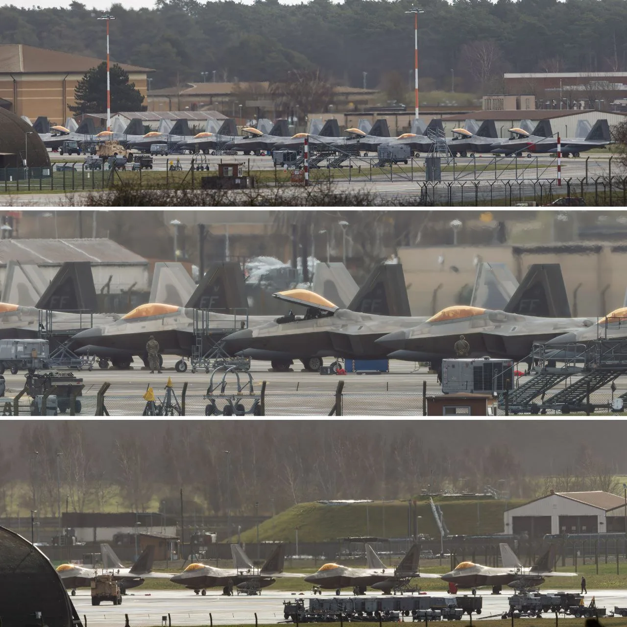 ◽Не менее 12 истребителей пятого поколения F-22A Raptor ВВС США были замечены на британской авиабазе Лейкенхит курсом на Ближний Восток.