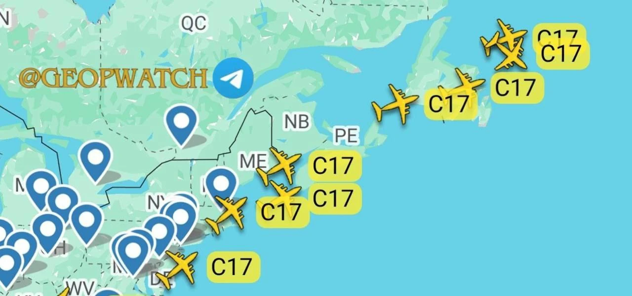 ◽Как минимум 8 дополнительных военно-транспортных самолётов C-17 Globemaster III ВВС США летят через Атлантический океан, и ещё больше готовятся к полёту в рамках усиления американских ВВС на Ближнем Востоке.