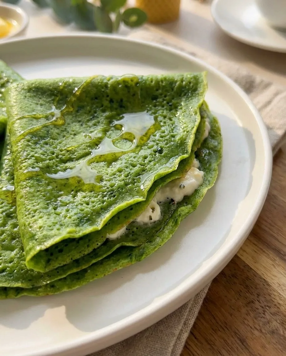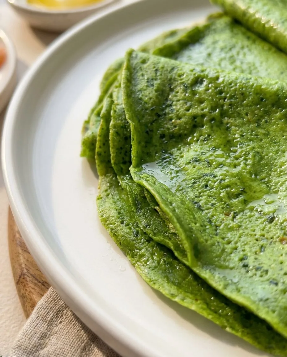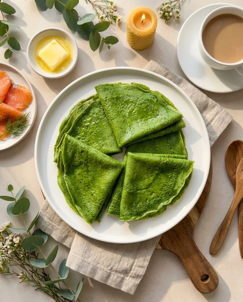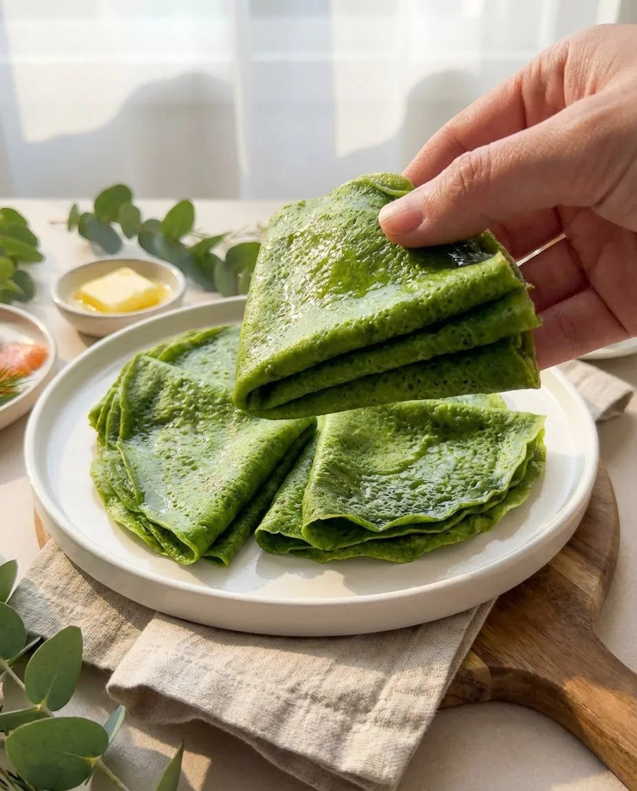 В блендере взбить шпинат и яйца. В слегка теплое молоко добавить шпинатную смесь,соль,сах.зам и порционно всыпать муку,добавить гашеную соду,замесить тесто и последним этапом добавить масло. Тесто накрыть и оставить на 30 минут на столе. Сковороду хорошо нагреть,смазать 1 раз маслом и выпекать тонкие блинчики