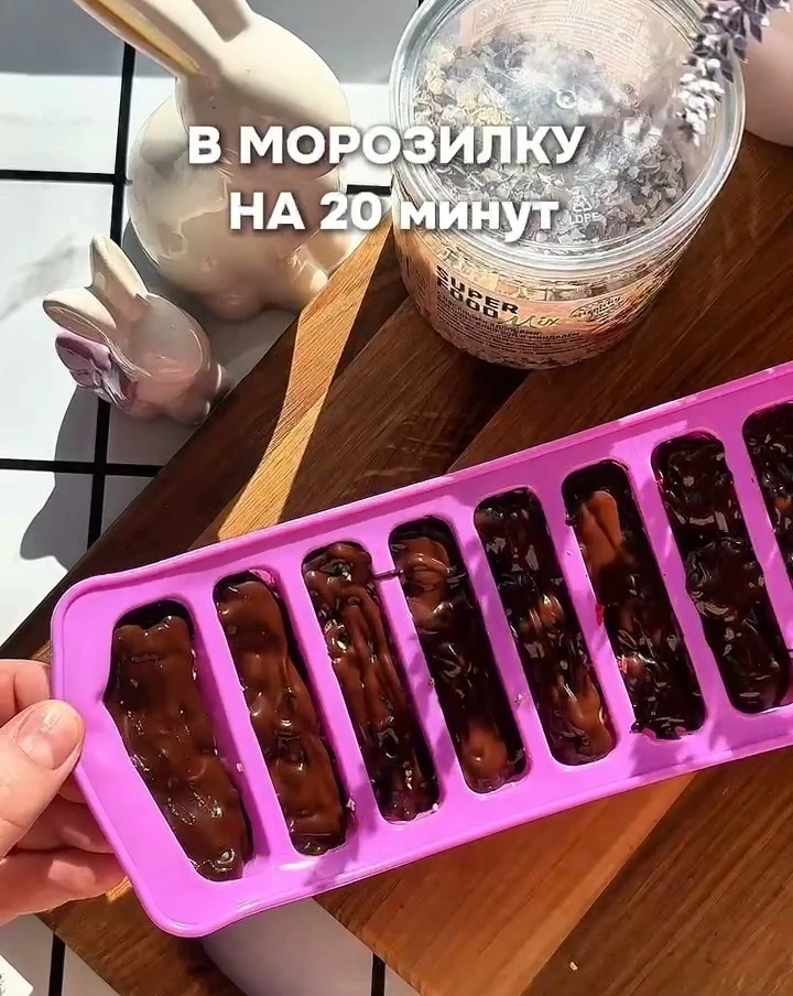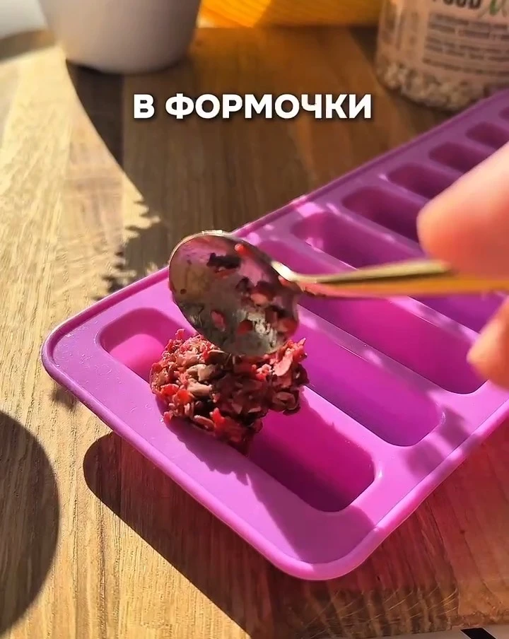 Смешайте банан и малину со смесью семян. Выложите массу в формочки и залейте растопленным шоколадом. Уберите в морозилку на 15-20 минут.