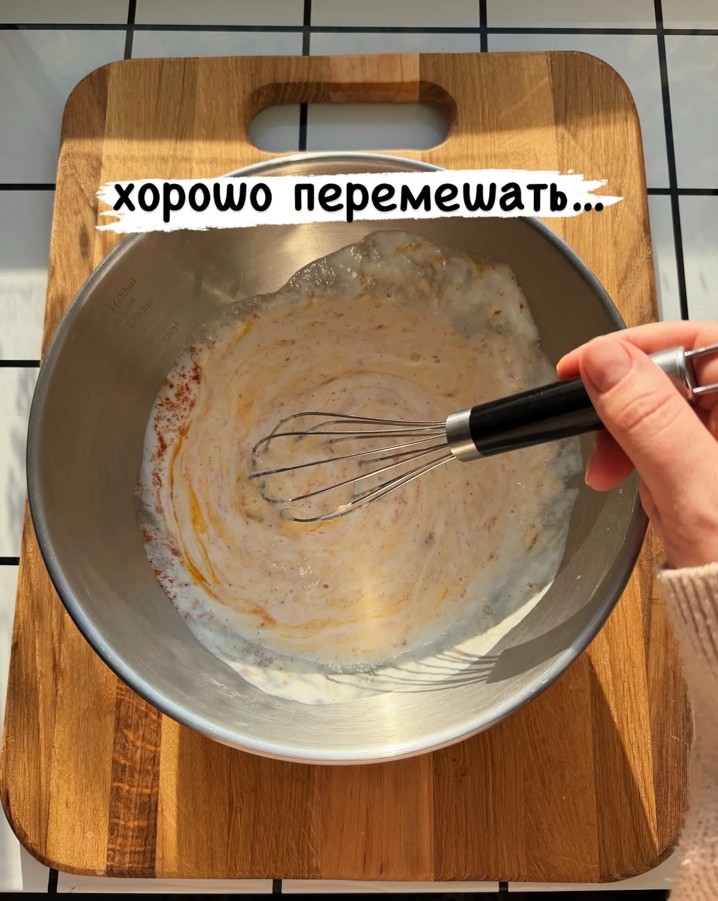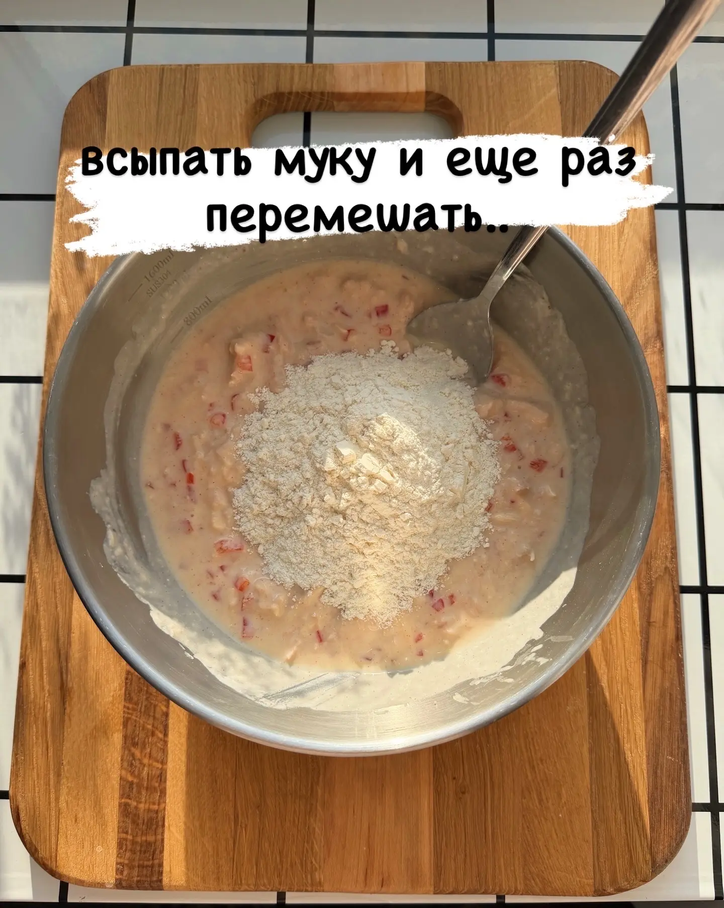 ЛОЖКОЙ,никаких венчиков !! Затем добавить вторую часть муки, перемешать и оставить примерно на 20-30 минут на столе.