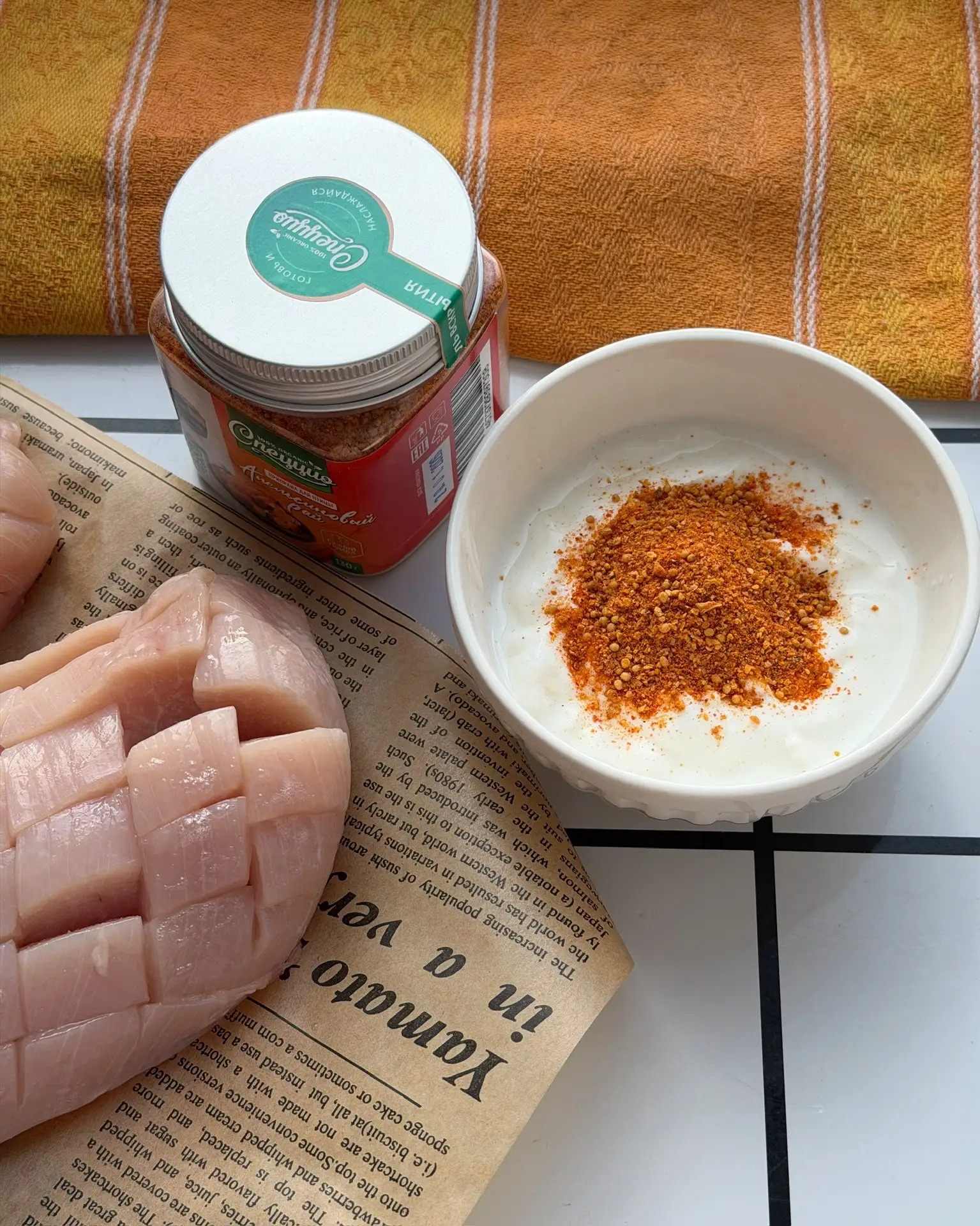 Грудку нарезать как на фото,посолить. В йогурт добавить приправу и щепотку соли. Смазать грудку и запечь в аэрогриле или в духовке