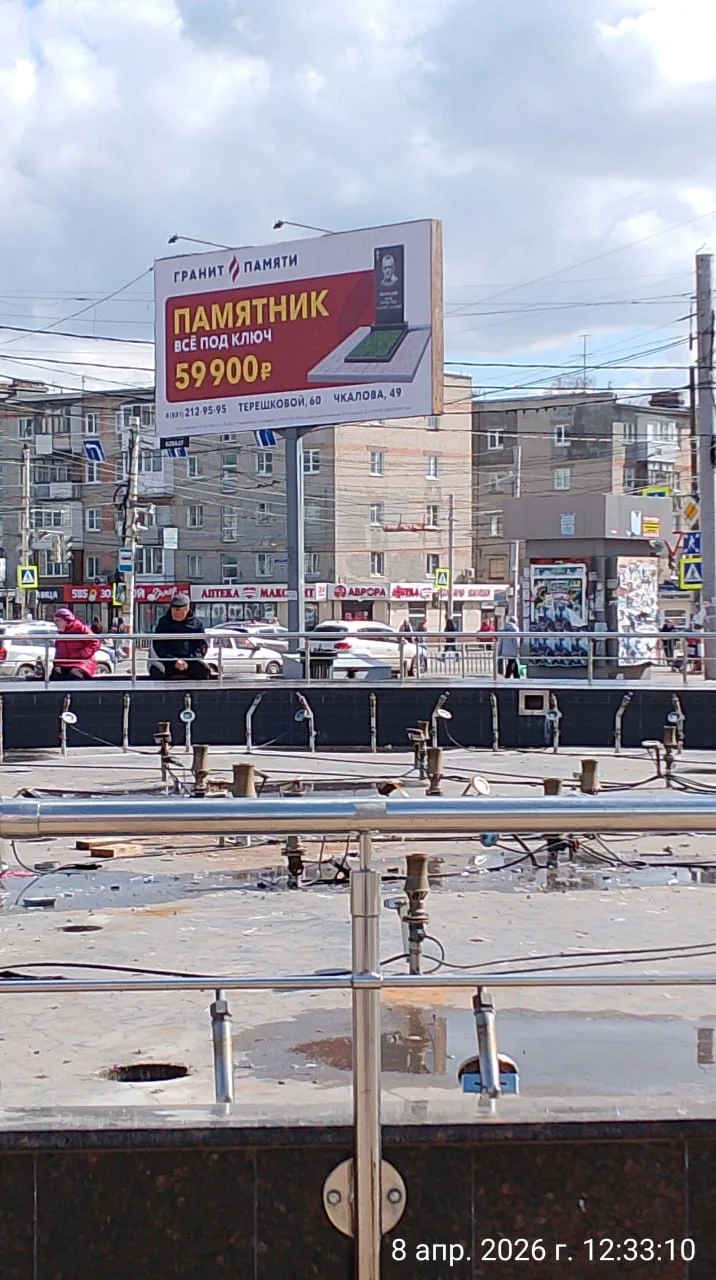 Торговая площадь города. Фонтан. Место отдыха горожан. И вот такая реклама! Это каким надо быть недалеким, чтобы разрешить это установить в центре города, где отдыхают люди, в т.ч. пенсионеры. Это чтобы помнили, что им это скоро понадобится? Хорошего вам отдыха пенсионеры, но не забывайте о том, что ничто не вечно. Так рассуждали предприниматель, хозяин рекламы, и тот недалекий из администрации города? Им совет бесплатный. Установите такой же рекламный щит перед окнами своих родителей. Пусть видят и помнят о вечном.