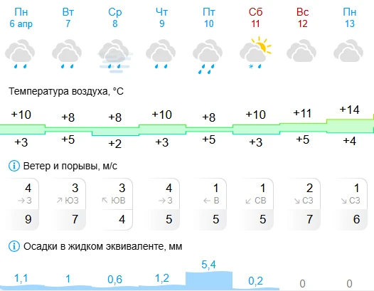 7 и 8 апреля также ожидаются небольшие осадки в виде дождя. Синоптики также предупреждают о сильном ветре — до 18 м/с 7 апреля.