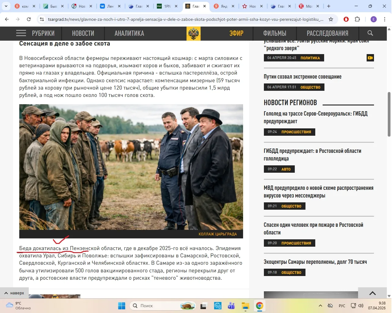7 апреля 2026 г. телеканал «Царьград» сообщил, что эпидемия пастереллёза, из-за которой во многих регионах произошел массовый забой скота, якобы началась в Пензенской области еще в декабре 2025-го.