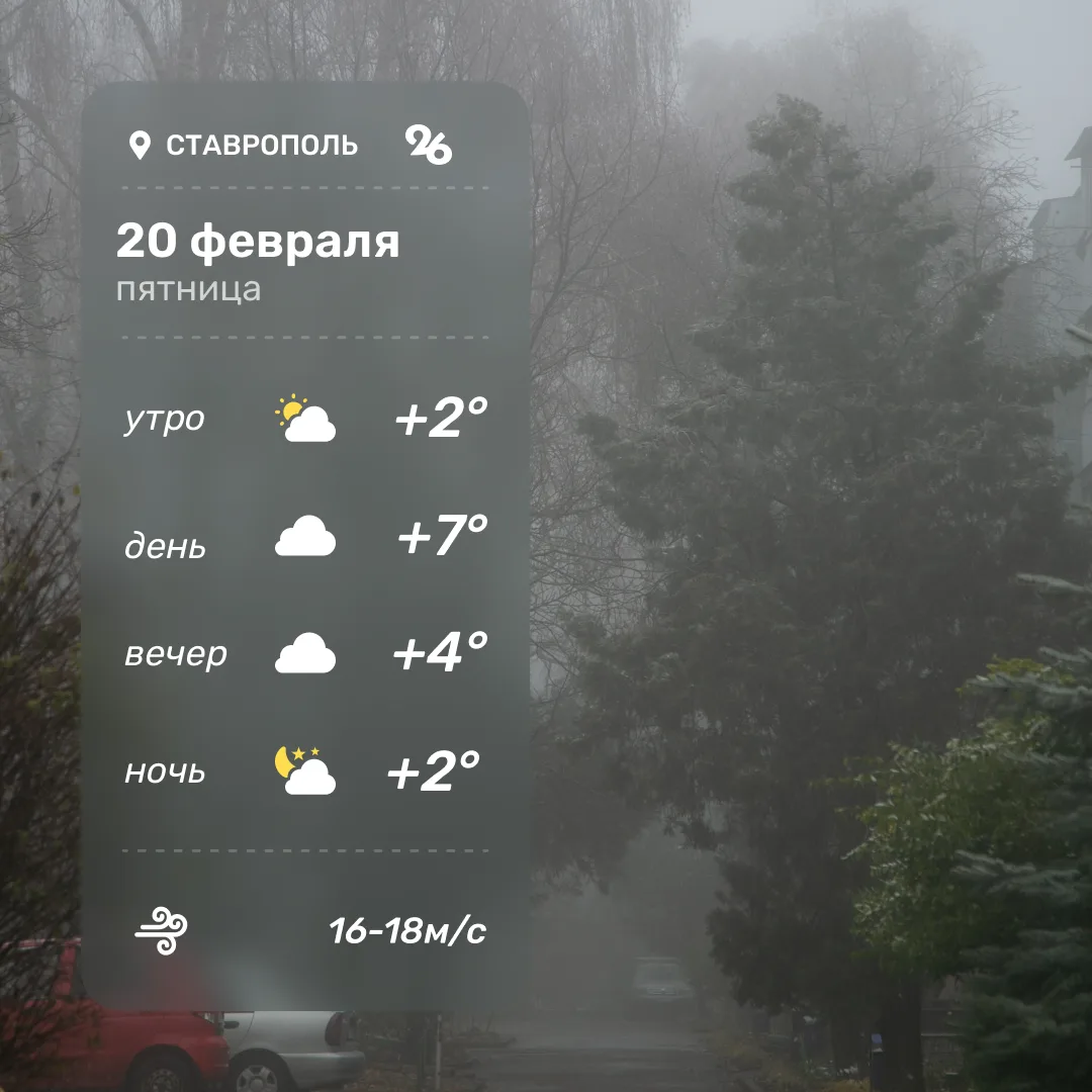 Ставропольцы, если вы привыкли к необычайно теплому февралю и уже спрятали зимние вещи, то самое время достать их из шкафа обратно. В субботу, 21 февраля, погода ещё порадует теплом. Днём местами по краю будет +5°...+16°C, а в Ставрополе столбики термометра поднимутся до +9°...+11°C. Ночью заметно похолодает до -1°...-6°