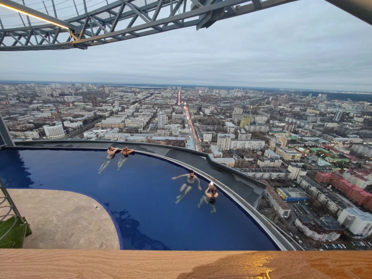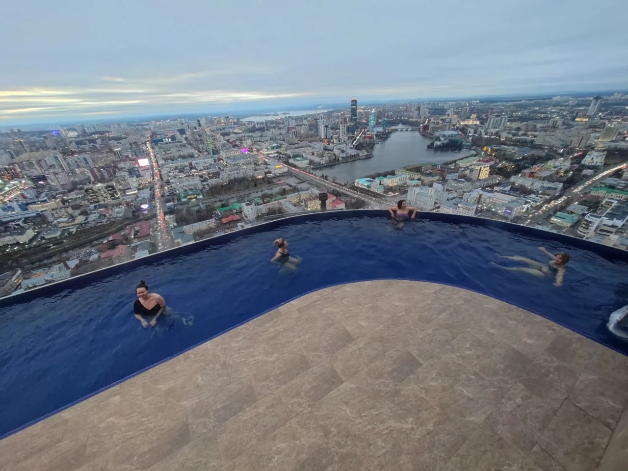 Представьте: за бортиком бассейна – весь город как на ладони, морозный воздух (зимой), люди в пуховиках спешат по своим делам. А вы в это время… лежите в подогреваемой воде с температурой +28°C и смотрите на крыши с высоты 186 метров.