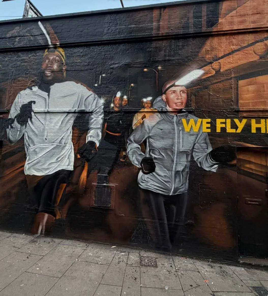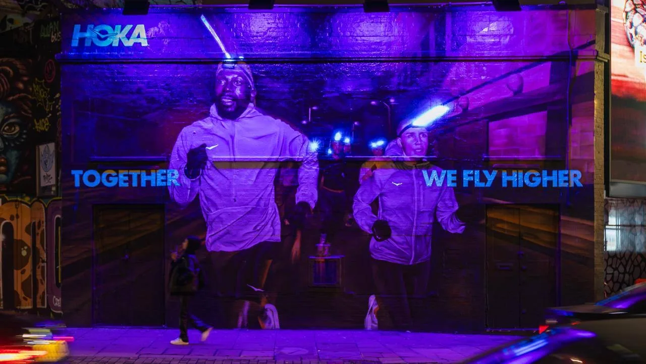 HOKA в Лондоне сделали мурал с двойной жизнью: днём — обычное изображение, ночью — светящееся благодаря ультрафиолетовой краске. Рядом установили фонари, имитирующие свет налобных фонариков, — и стена буквально «бежит» в темноте.