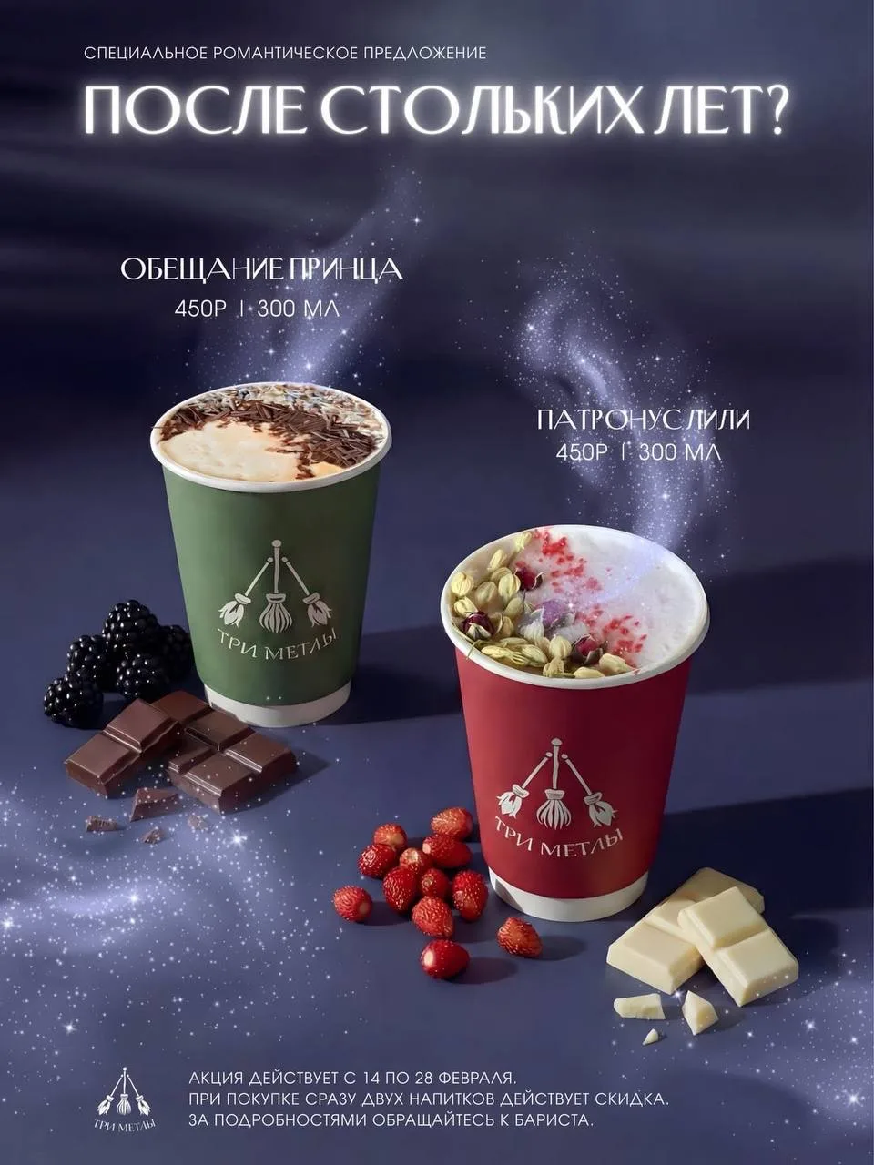 В кофейне «Три метлы» к 14 февраля появились парные напитки по мотивам Гарри Поттера — попробовать можно только до 28 февраля.