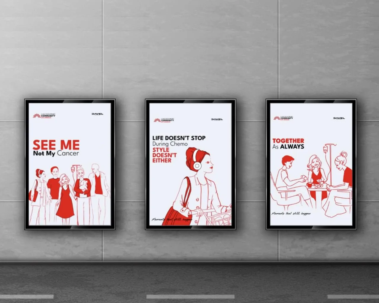 Агентство Davel вместе с Cancer Support Community запустили кампанию против стигматизации онкобольных. На билбордах — лаконичные, почти контурные изображения людей в обычной жизни: ужин с семьёй, поход за покупками, свидание. У кого-то заметен катетер, у кого-то — последствия химиотерапии. Подпись простая: «Моменты продолжают случаться».