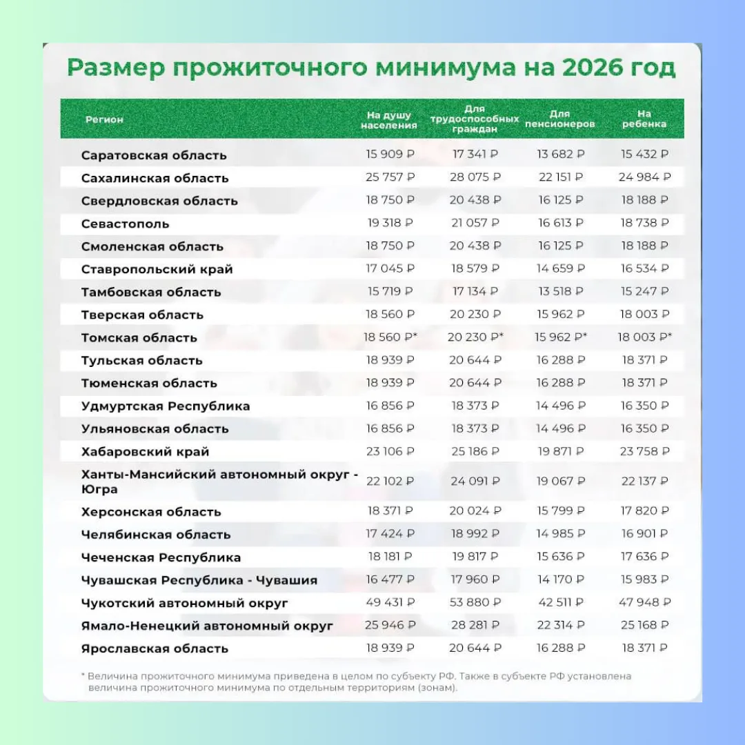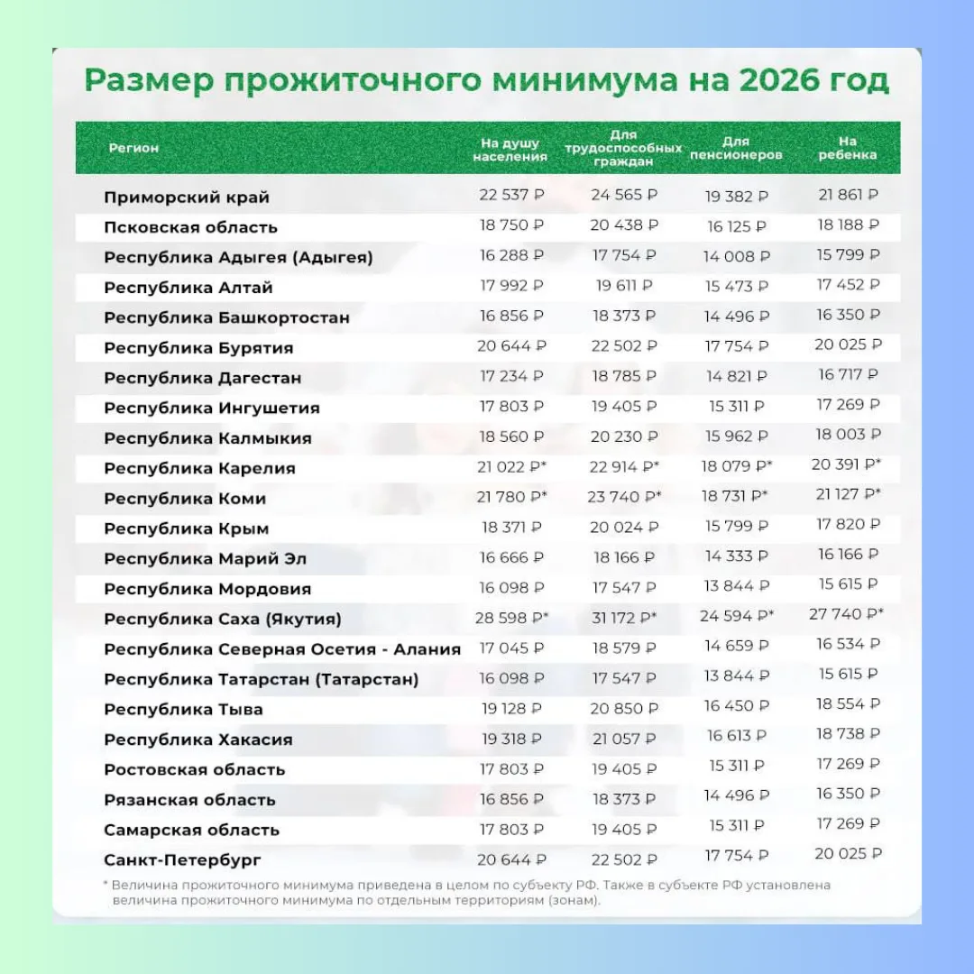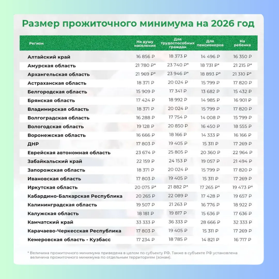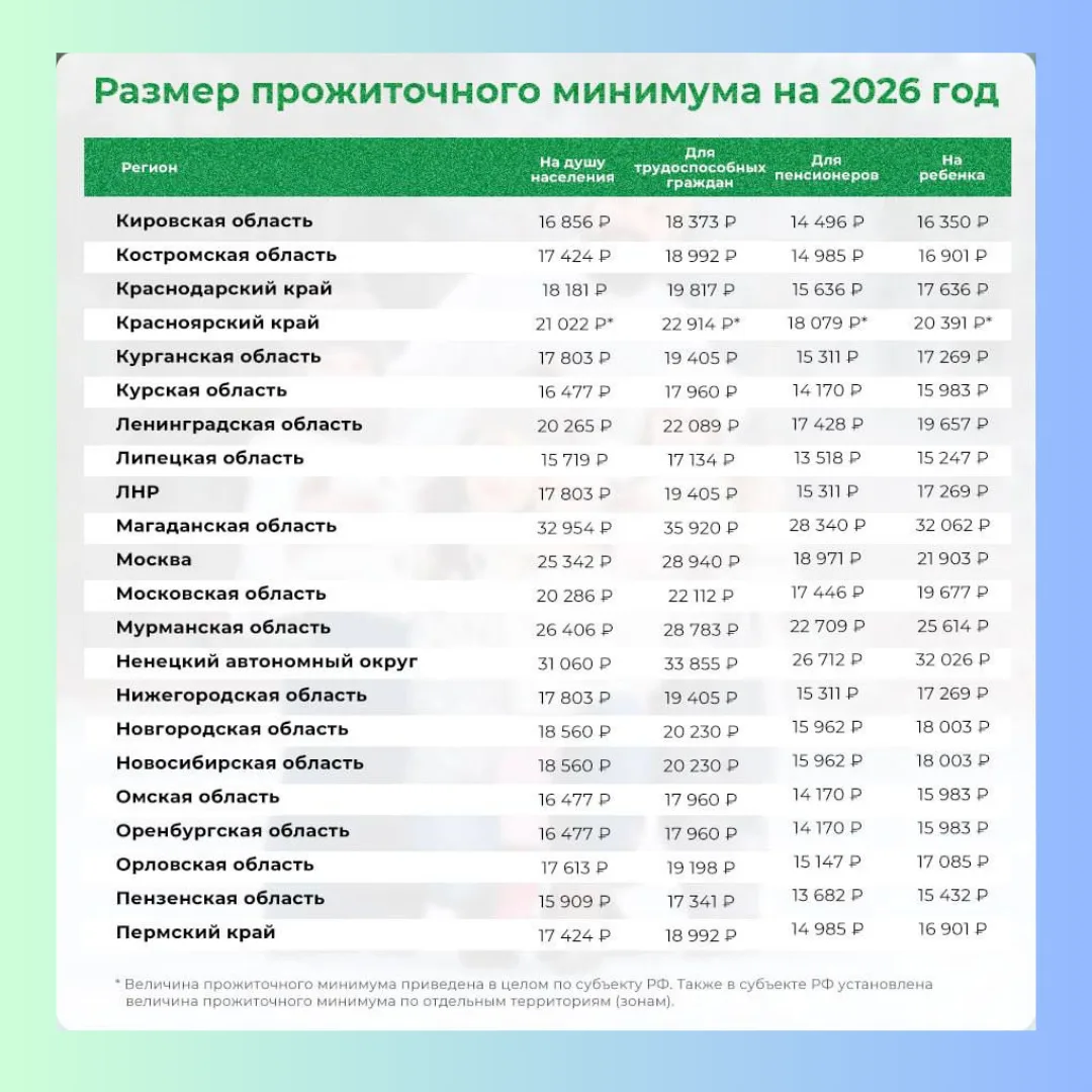 📈 Прожиточный минимум в регионах России на 2026 год