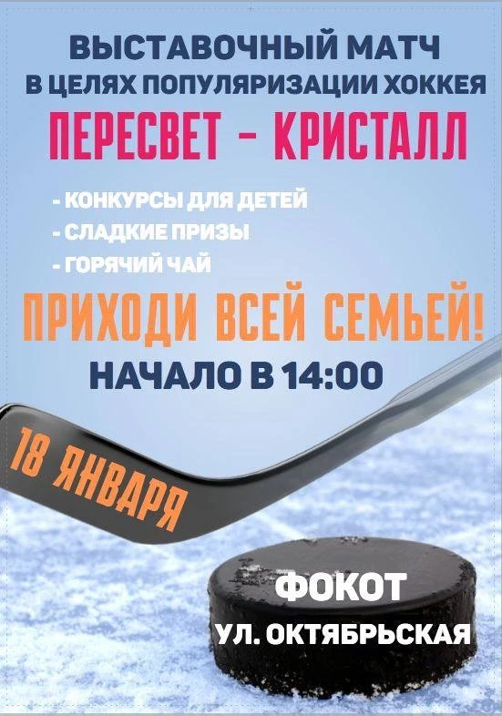 В 14:00 на «ФОКОТе» (ул. Октябрьская) состоится выставочный матч с целью популяризации хоккея.