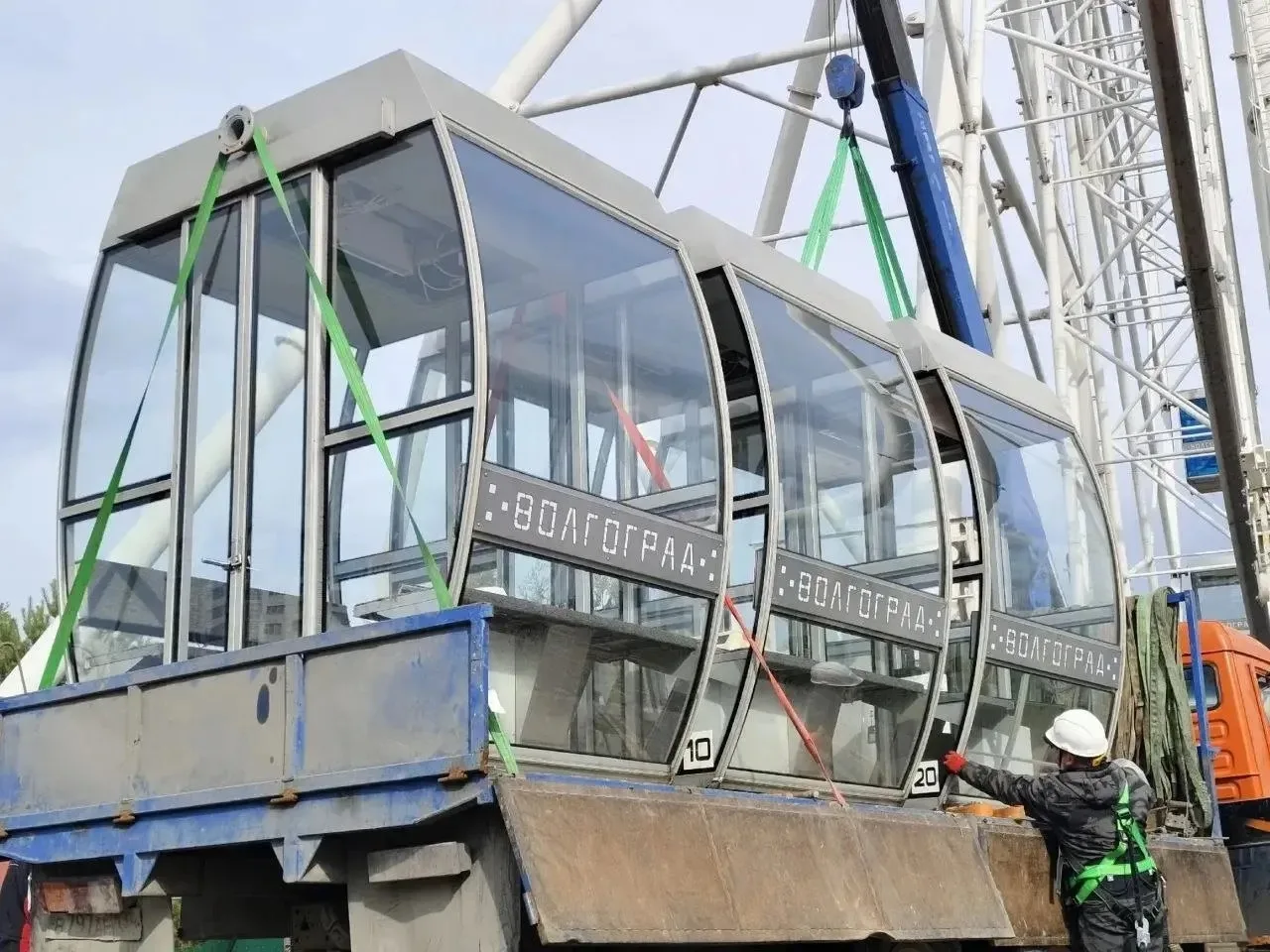 завершат установку 6 опорных колонн, после чего перейдут к поэтапной установке центрального вала, вант, окружности, посадочных модулей и других деталей. Комплектующие сейчас покрашены черновым слоем краски, так как в процессе работ на них оседают металлическая пыль и грязь. Поэтому после завершения монтажа колонны и другие детали очистят, обработают и покрасят финальным слоем краски в белоснежный цвет.
