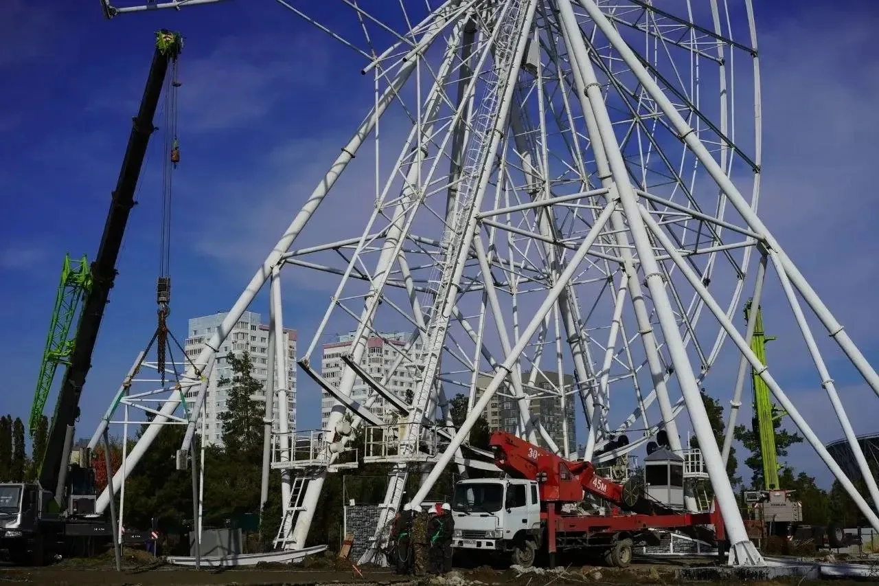 Сейчас в парке активно ведутся строительные работы. Но все внимание приковано к главной площадке — площадке, на которой возводят 120-метровое вантовое колесо обозрения!