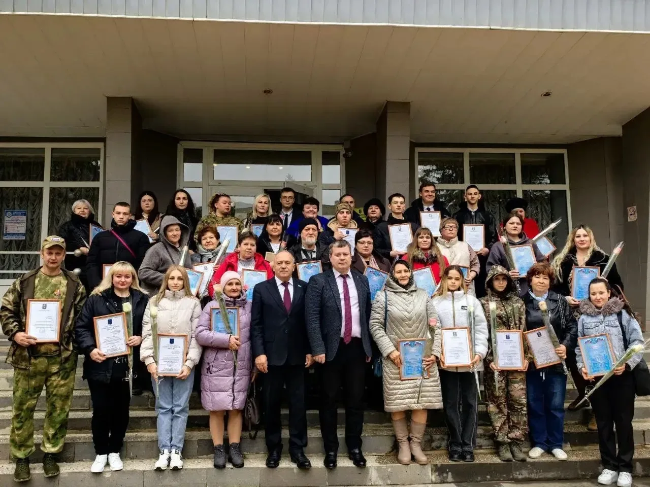 Сегодня в зале администрации присутствовали волонтеры добровольческих организаций «Сила добра», «Рука помощи Донбассу. Команда Деда», «ВкусноЦех», «Донской Гуманитарный Фронт», «Волонтер СВО», «Тихий Дон для СВОих», «Дела Милосердия», «ZOV души», «Котелок Победы», «СВОих не бросаем», «Инженерные войска», «Кулинарный батальон».