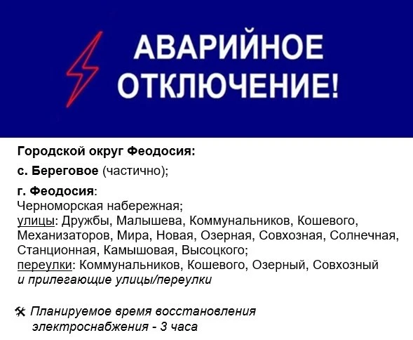 💡 Более 20 улиц Феодосии остались без света из-за аварии.