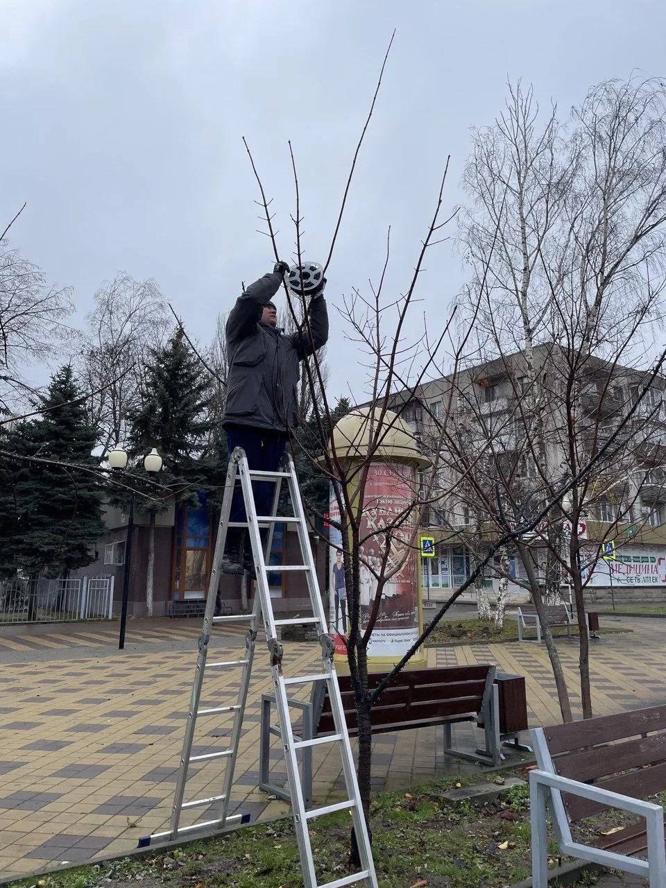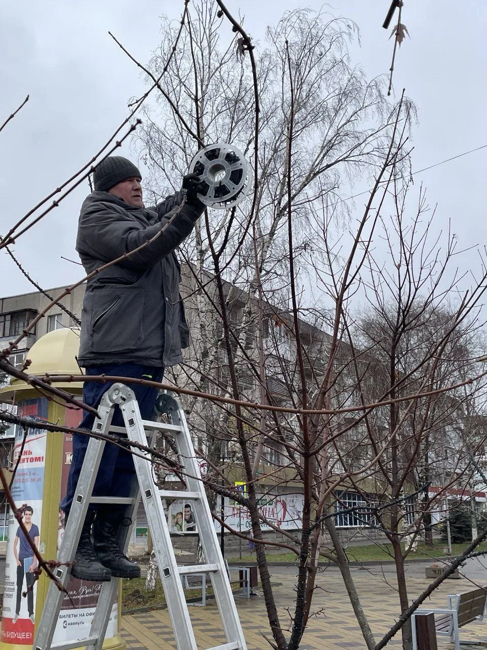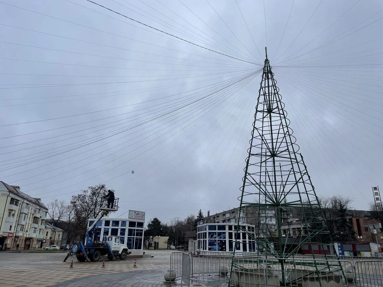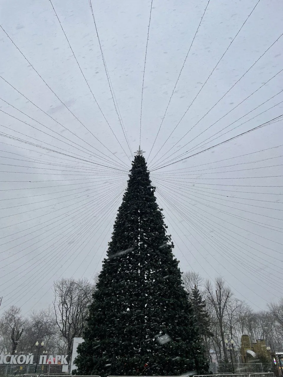 Улицы и ёлки потихоньку, но уверенно наряжают. Так, монтаж главной новогодней красавицы ещё в процессе. Её убранство дополнит иллюминация и вуаль «звёздное небо».