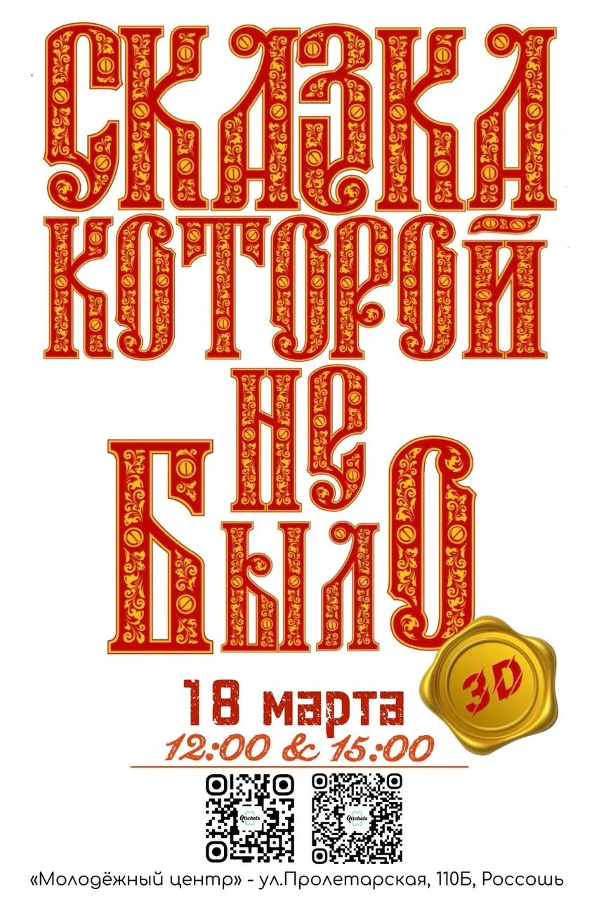 В преддверии весенних каникул рады пригласить вас и ваших детей на интерактивный 3D спектакль «Сказка, которой не было», который пройдёт на большой сцене Молодёжного центра, по адресу ул.Пролетарская, 110Б, Россошь: