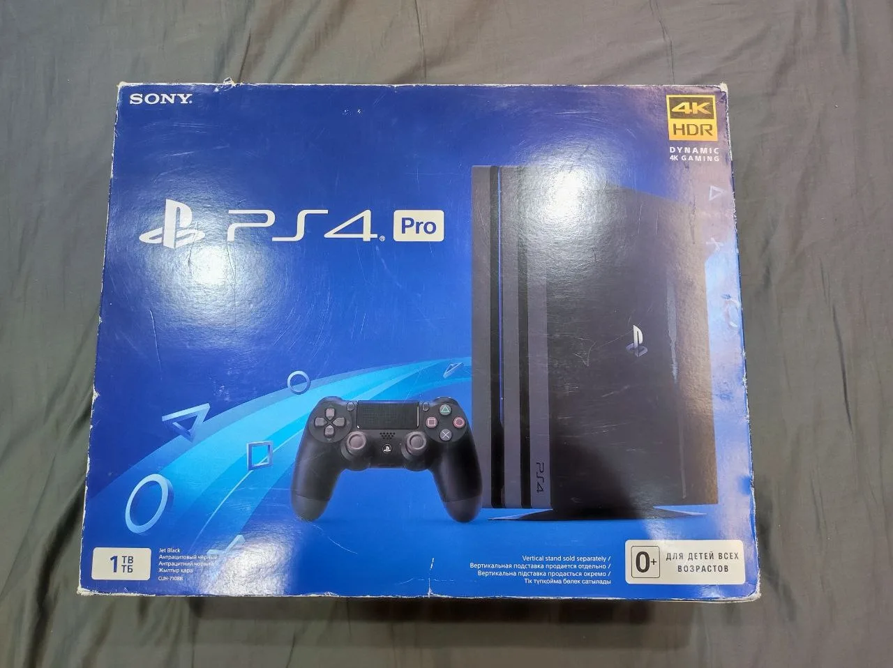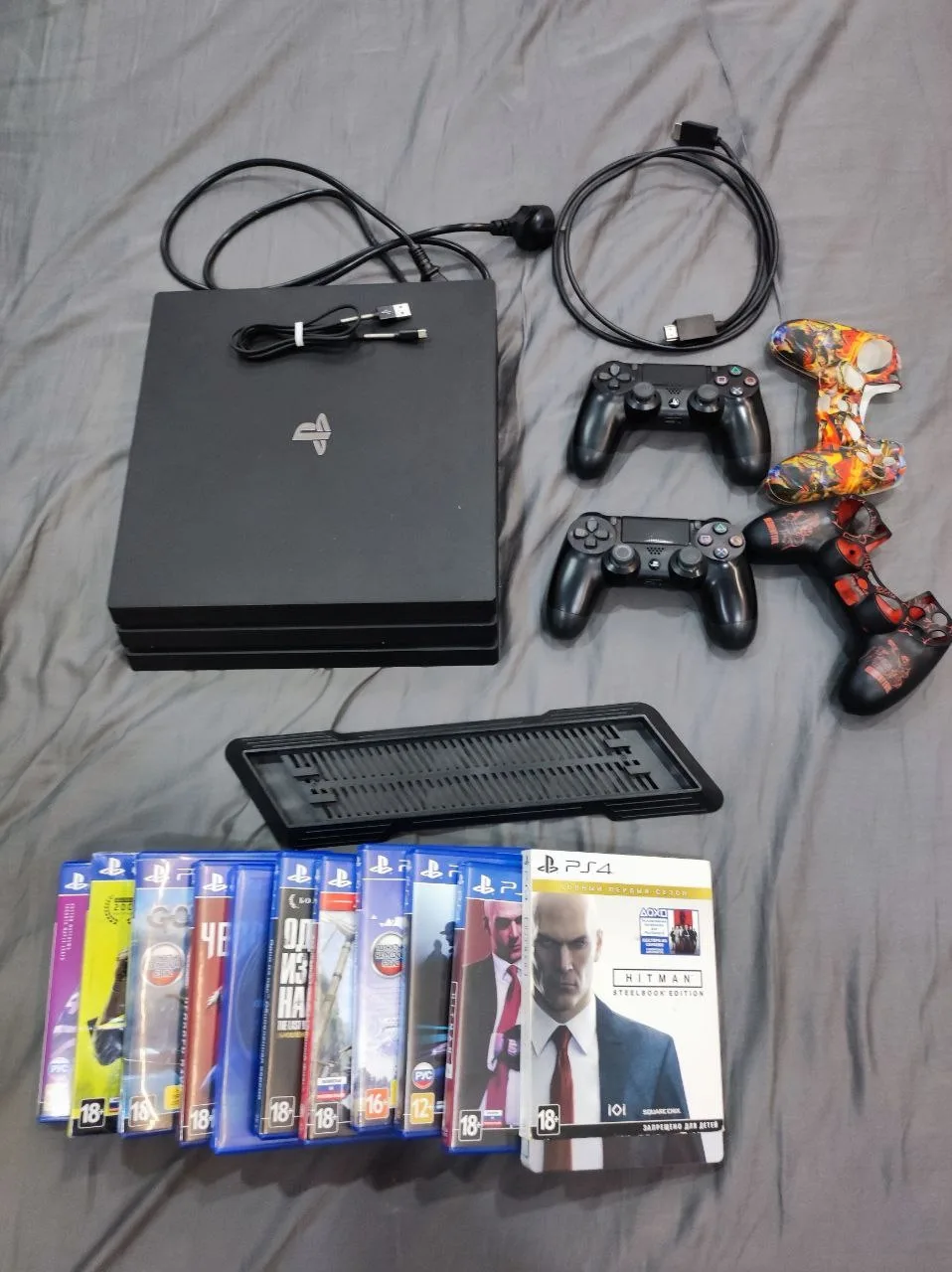Продаётся игровая приставка Sony PlayStation 4 Pro с объёмом памяти 1 ТБ. В комплекте оригинальная коробка, кабель питания, HDMI-кабель, подставка для вертикальной установки и два геймпада, чехлы с индивидуальным оформлением.