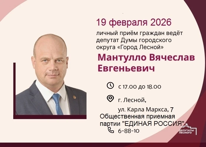 Муниципальная дума Лесного продолжает практику еженедельных приемов горожан. Сегодня, 19 февраля, встречу проведет депутат Вячеслав Мантулло.