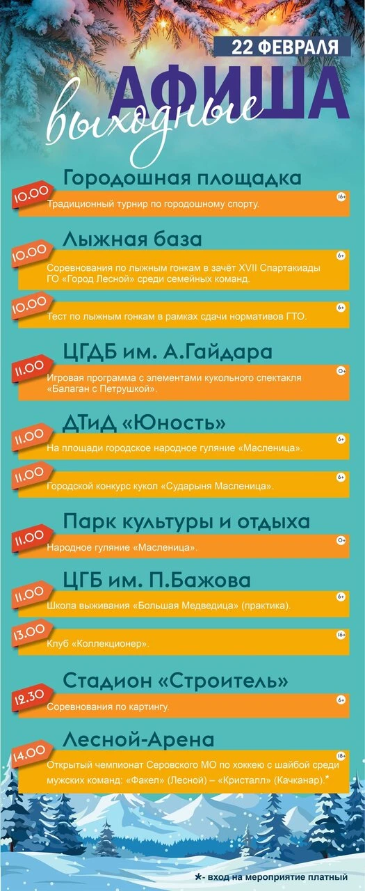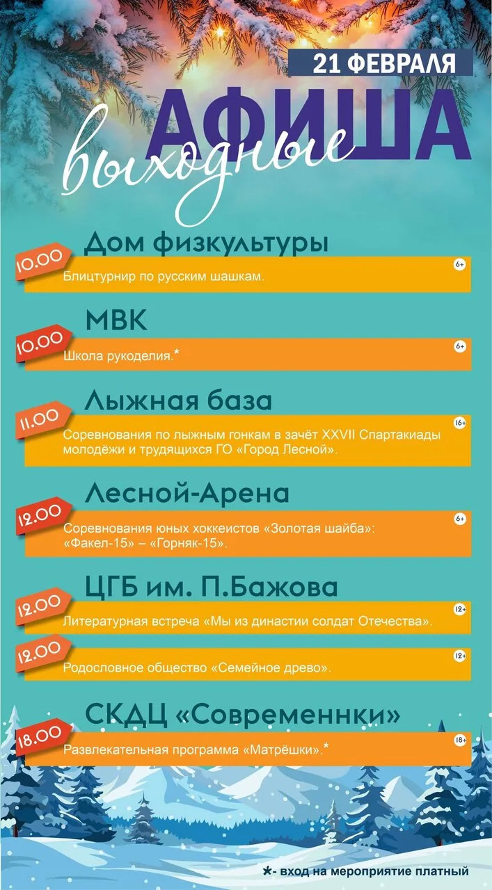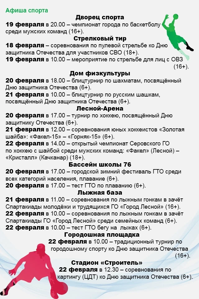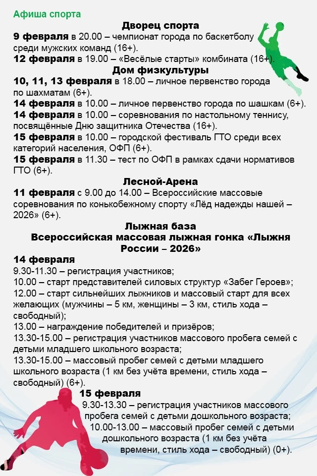 20 и 21 февраля в Доме физкультурника состоятся блиц-турниры по шахматам и шашкам. На пятницу в комплексе «Лесной-Арена» запланирован турнир по хоккею.