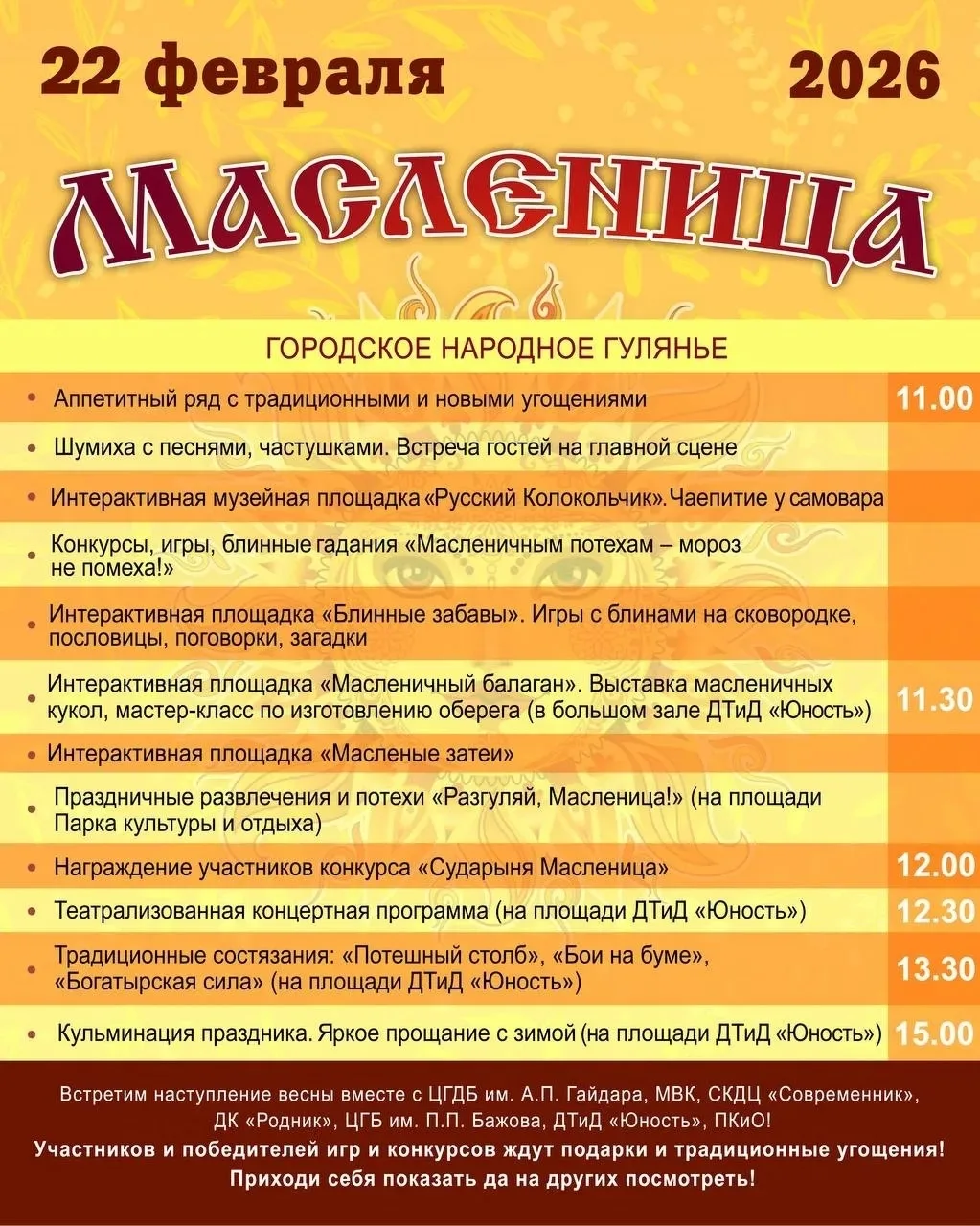 Каждый день недели имеет свои традиции и свое название. К примеру, понедельник ― встреча Масленицы. Завтра ― заигрыш. А затем последуют «лакомка», «широкий четверг», «тещины вечерки» и «золовкины посиделки». Праздничная неделя продлится до 22 февраля. Этот день называют Прощеным воскресеньем и отмечают Широкую Масленицу. Главные традиционные атрибуты этого народного празднования — сжигание чучела, катание на санях и обязательно — блины. И уже в следующий понедельник у православных верующих начнется Великий пост.
