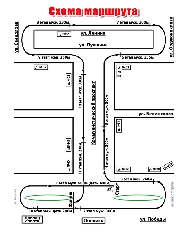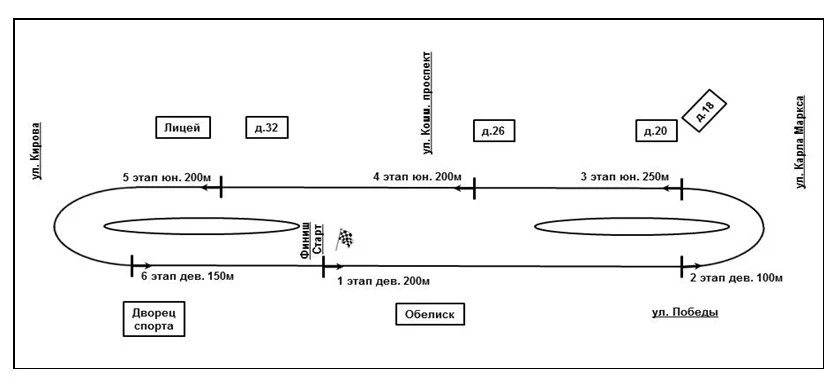 6 классы бегут по ул. Победы в границах ул. Карла Маркса и ул. Кирова. Остальные забеги бегут большую эстафету (по маршруту 2016 года) по улицам города со стартом в районе Обелиска Победы (от угла дома Победы, 26) по ул. Победы с поворотами перед ул. Кирова и Карла Маркса и далее по обычному маршруту – Ком. проспект, ул. Орджоникидзе, Ленина, Свердлова, Ком. проспект, финиш – у Обелиска Победы.