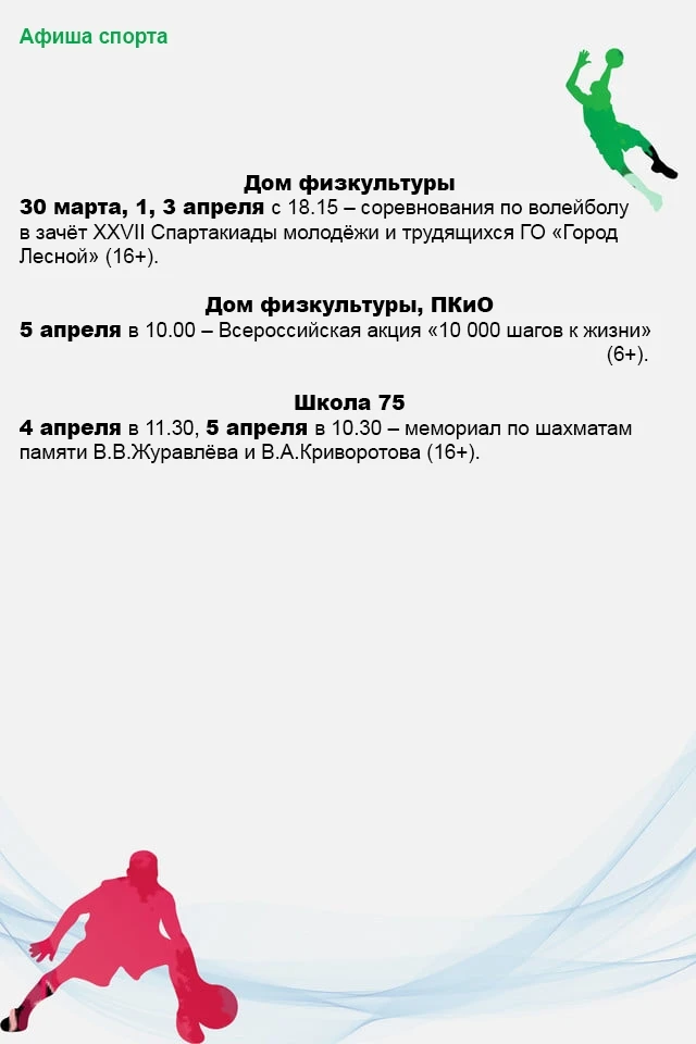 9 мая в Лесном состоится 75-я традиционная весенняя легкоатлетическая эстафета, посвященная 81-й годовщине со Дня Победы в Великой Отечественной войне 1941–1945 годов. Начало эстафеты в 12.00.