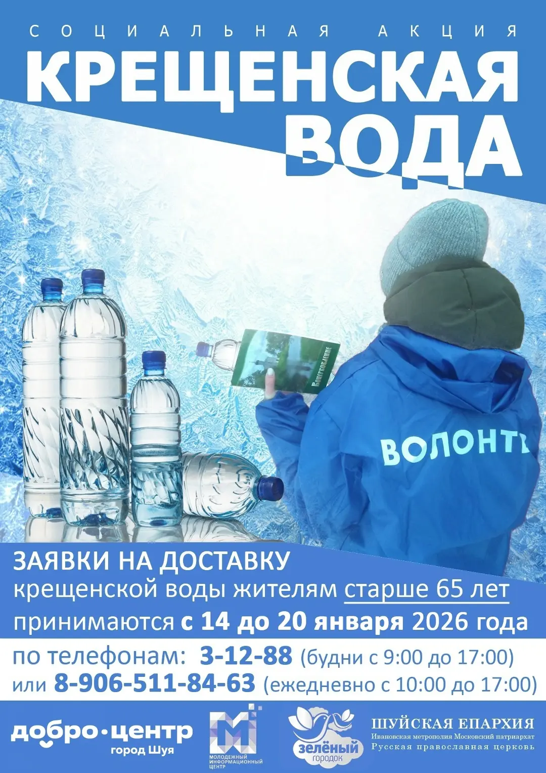 14 января стартует акция «Крещенская вода». Заявки на доставку крещенской воды принимаются от пожилых и маломобильных жителей Шуи.