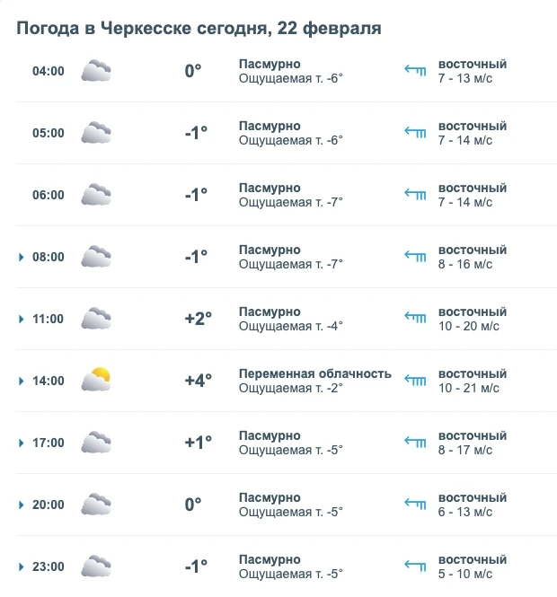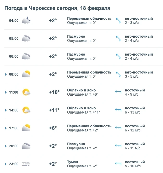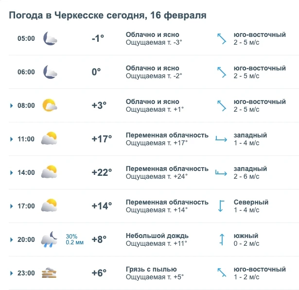 Погода: 14 февраля в Черкесске ожидается преимущественно дождливая погода. Температура воздуха будет колебаться в течение дня: ночью около +4 °C, утром потеплеет до +6 °C, днём достигнет +13 °C, а вечером снова похолодает до +7 °C. Ветер умеренный, со скоростью около 3 м/с. Влажность воздуха составит примерно 82%. Атмосферное давление — около 706 мм рт. ст..
