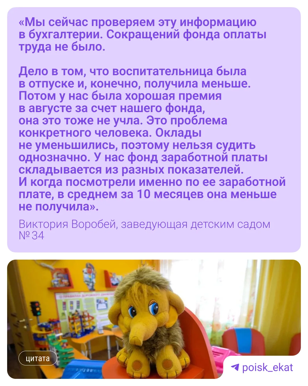 В мэрии Е1 ответили, что детскому саду не сокращали финансирование — наоборот, зарплаты воспитателей, как бюджетников, проиндексировали на 4%. То, как распоряжается этими деньгами детский сад, решает руководитель учебного заведения.