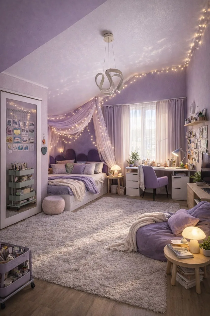 Немного волшебства. 1 день, никакого ремонта, зато теперь Алисе нравится ее комната ♥️ Ии нарисовал дизайн и нам осталось только добавь детали : заменили шторы, добавили тумбу под стол, большое кресло мешок и пара мини столиков. Самое главное много огоньков - гирлянда и ура, комната стала красивая и уютная ♥️