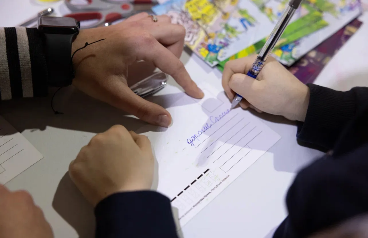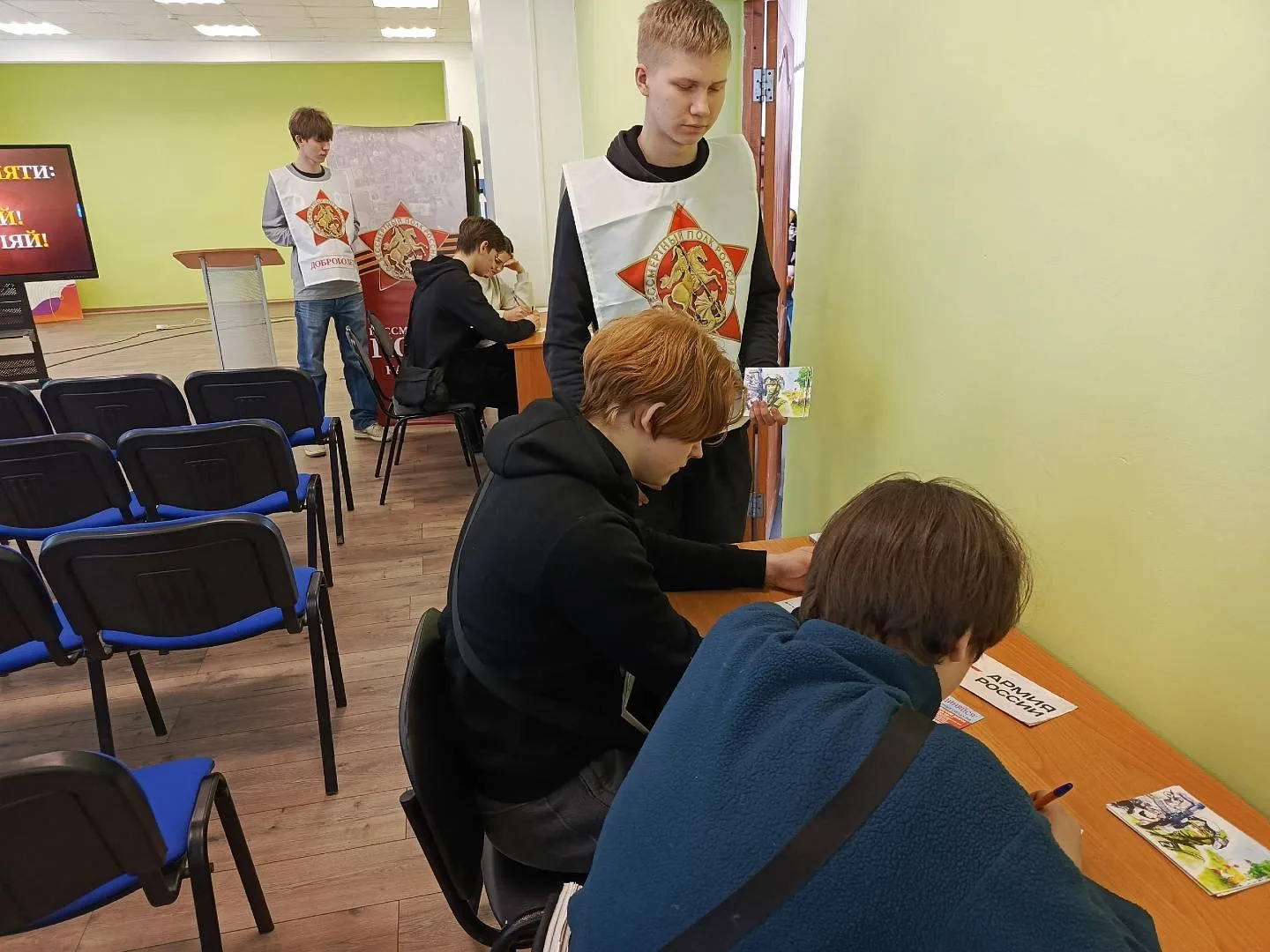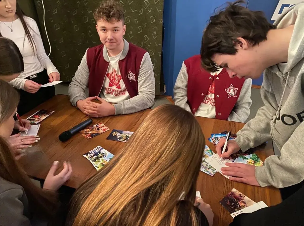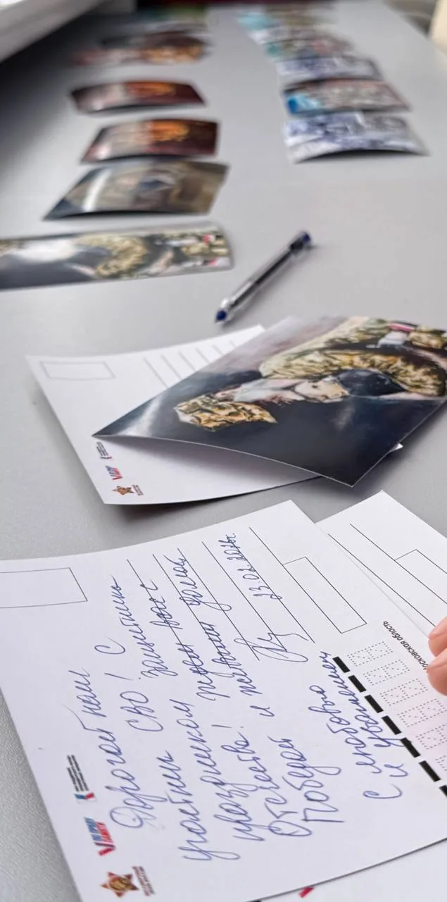 Традиционно, после показа участники мероприятия отправили поздравления участникам СВО на открытках, подготовленных из рисунков победителей конкурса «По праву памяти». Подписанные открытки сразу же были переданы в волонтерскую группу для отправки в зону СВО.