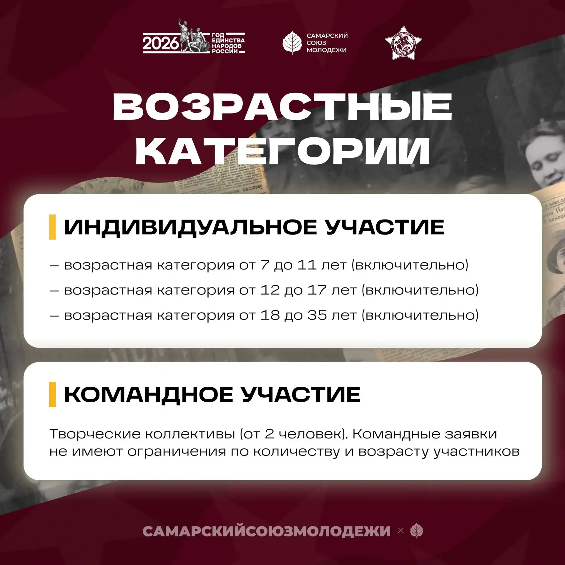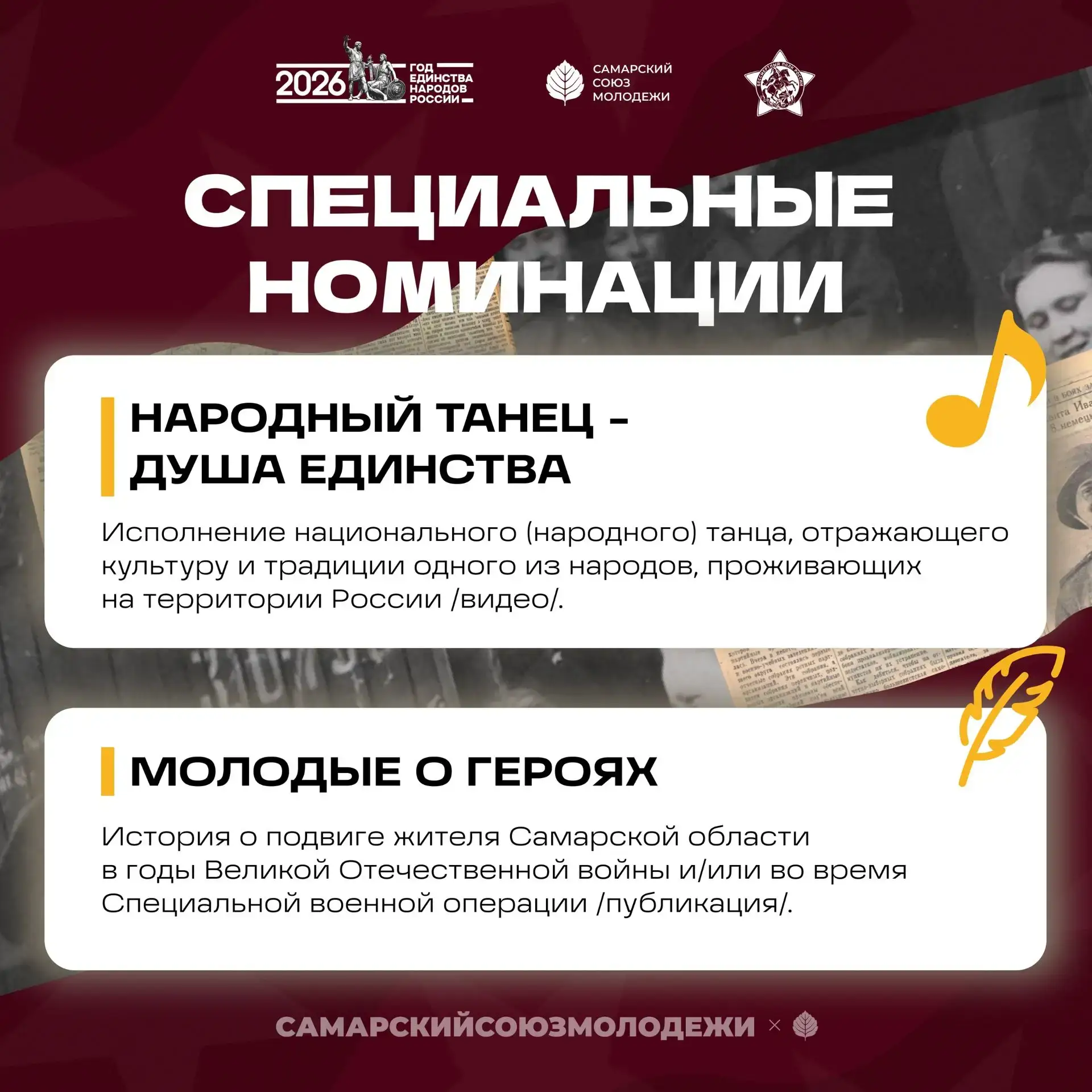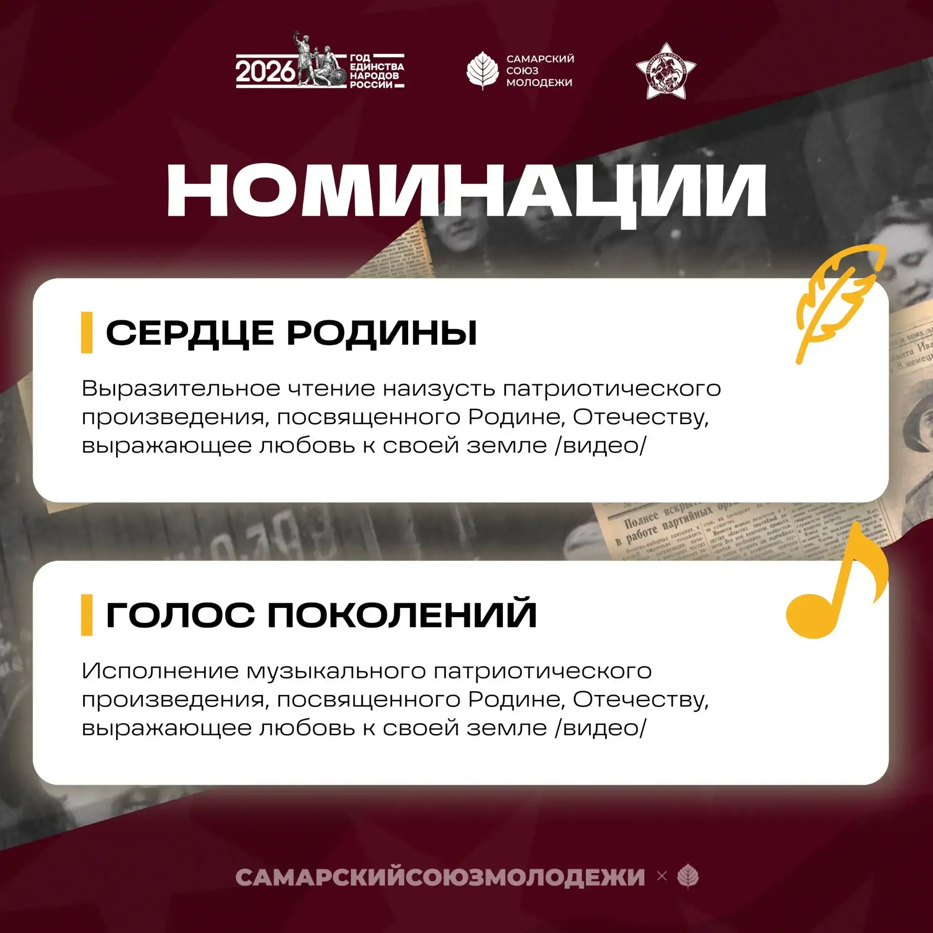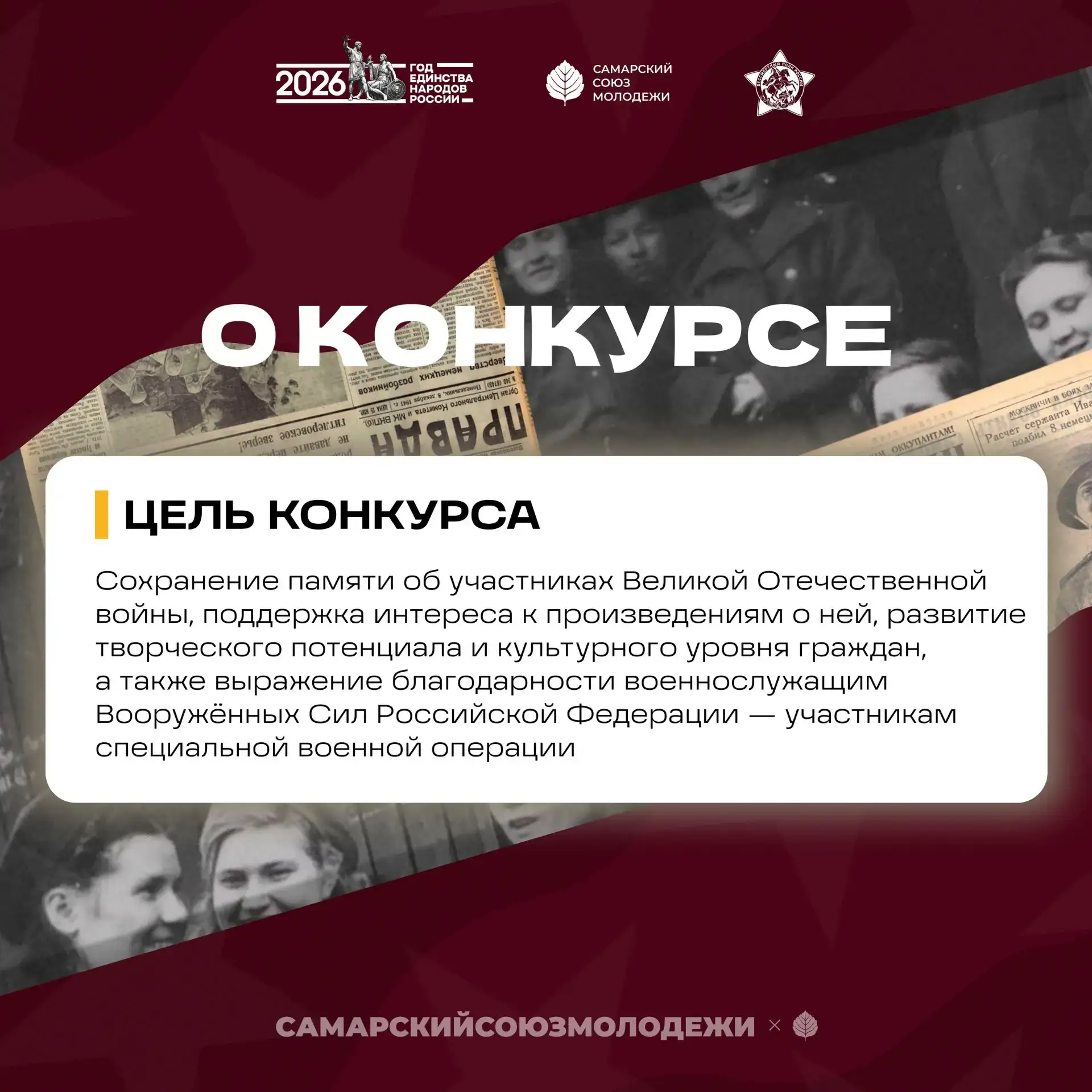 В Самарской области вновь стартовал конкурс творческих работ «На Zащите мира». Ежегодно региональное отделение Бессмертного полка России вместе с Самарским Союзом Молодежи проводит конкурс, который выявляет талантливых и артистичных жителей Самарской области. В этом году возможность показать всему региону свои способности у самарцев есть в четырех различных номинациях, о которых рассказали на карточках.
