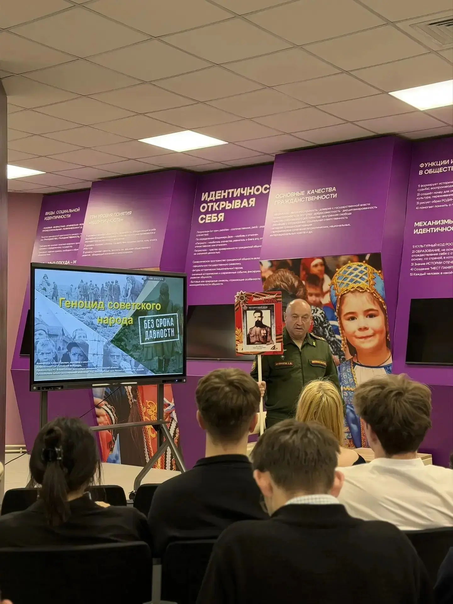 В Образовательном комплексе Андрей Фугенфиров продемонстрировал главный атрибут праздника – портрет ветерана, напомнил о необходимости беречь и передавать память о подвиге советского народа и своих семейных героев, в том числе через акцию «Бессмертный полк». Ещё на встрече однополчанин напомнил о важной дате, отмечаемой 19 апреля, – Дне памяти жертв геноцида советского народа. Ученики с большим вниманием слушали гостя и задавали вопросы о судьбах земляков, переживших войну, о значении Победы и о том, как важно помнить уроки истории.