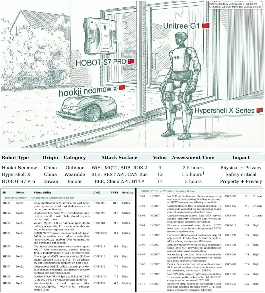Исследователи из Alias Robotics (занимаются кибербезопасностью робототехники) решили проверить, как современные LLM-ки справляются с взломом "умных железок". Взяли своего ИИ-агента CAI (Cybersecurity AI), дали ему трёх разных бытовых роботов и отправили искать уязвимости.