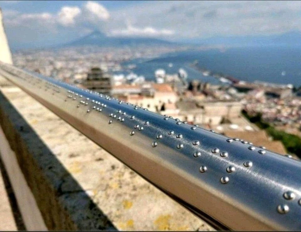На перилах - шрифт Брайля, который используется для чтения слепыми людьми. Им описывают прекрасный вид на Неаполитанский залив, который открывается у них перед глазами.