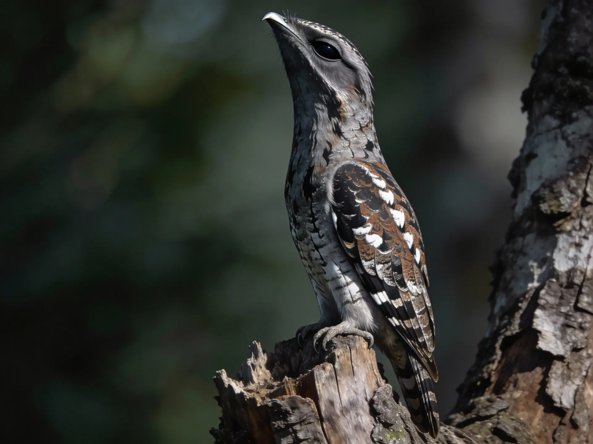 Днём эта птица сидит на торце сухого пня, вытягивается «стрункой», закрывает глаза — и буквально исчезает. Оперение повторяет текстуру коры так точно, что даже с пары шагов её не отличить от ветки.