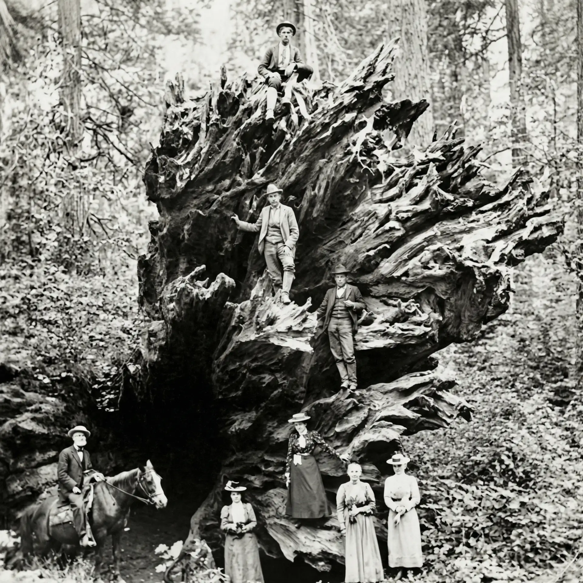 Так начинался мировой туризм, 1902 год. Туристы позируют на фоне упавшей гигантской секвойи.