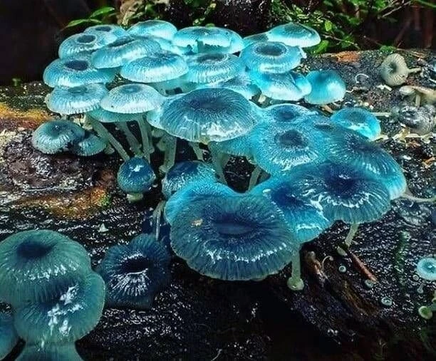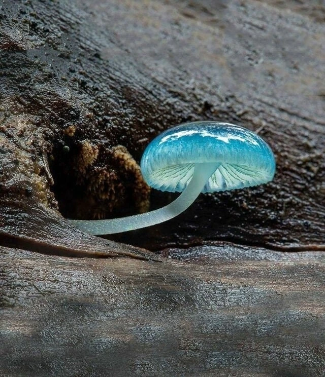 Шляпки гриба полупрозрачные, ярко-синего цвета. В диаметре достигают двух сантиметров.