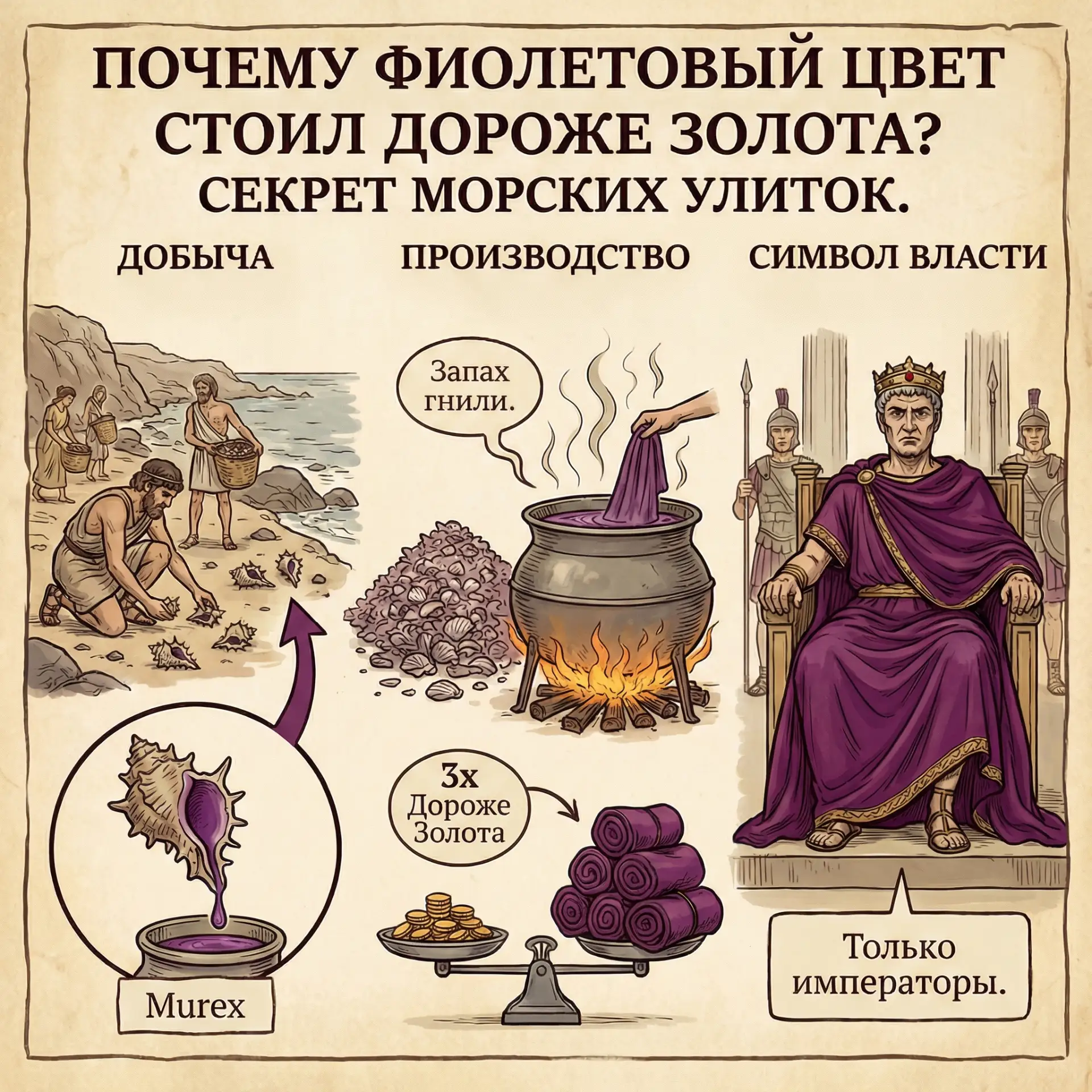 Из каждой улитки добывали всего капельку красящего вещества, которое к тому же жутко пахло гнилью, пока не высыхало. Пурпурная одежда стоила безумных денег (в 3 раза дороже золота такого же веса), поэтому стала символом власти. По сути, короли носили на себе кладбище моллюсков.