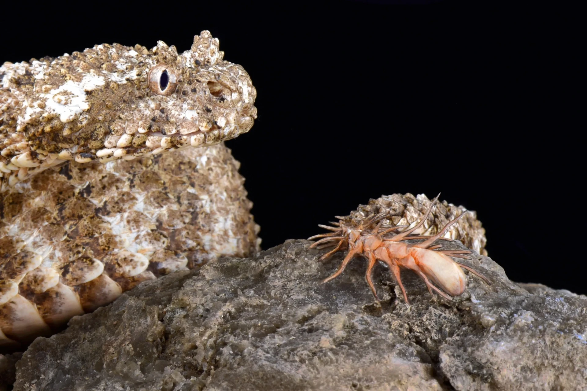 Змея лежит неподвижно, сливаясь с камнями. А хвост начинает выписывать восьмёрки — ровно так, как шевелится настоящий членистоногий.