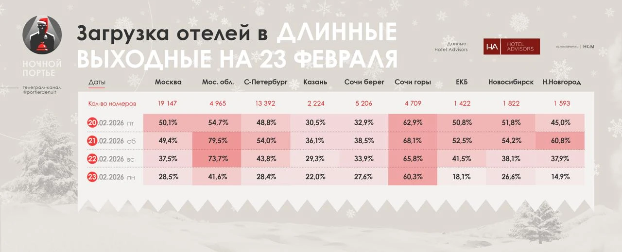 Бронирования посуточных квартир на 21–23 февраля выросли на 25%. Лидеры спроса — Московская и Ленинградская области, Краснодарский край, Мурманская область, Татарстан. Средний чек при этом вполне массовый: 3,2–3,4 тыс. руб. за сутки, бронирование на две ночи компанией из трёх человек. То есть классический сегмент short leisure, который традиционно считался «городским отельным».